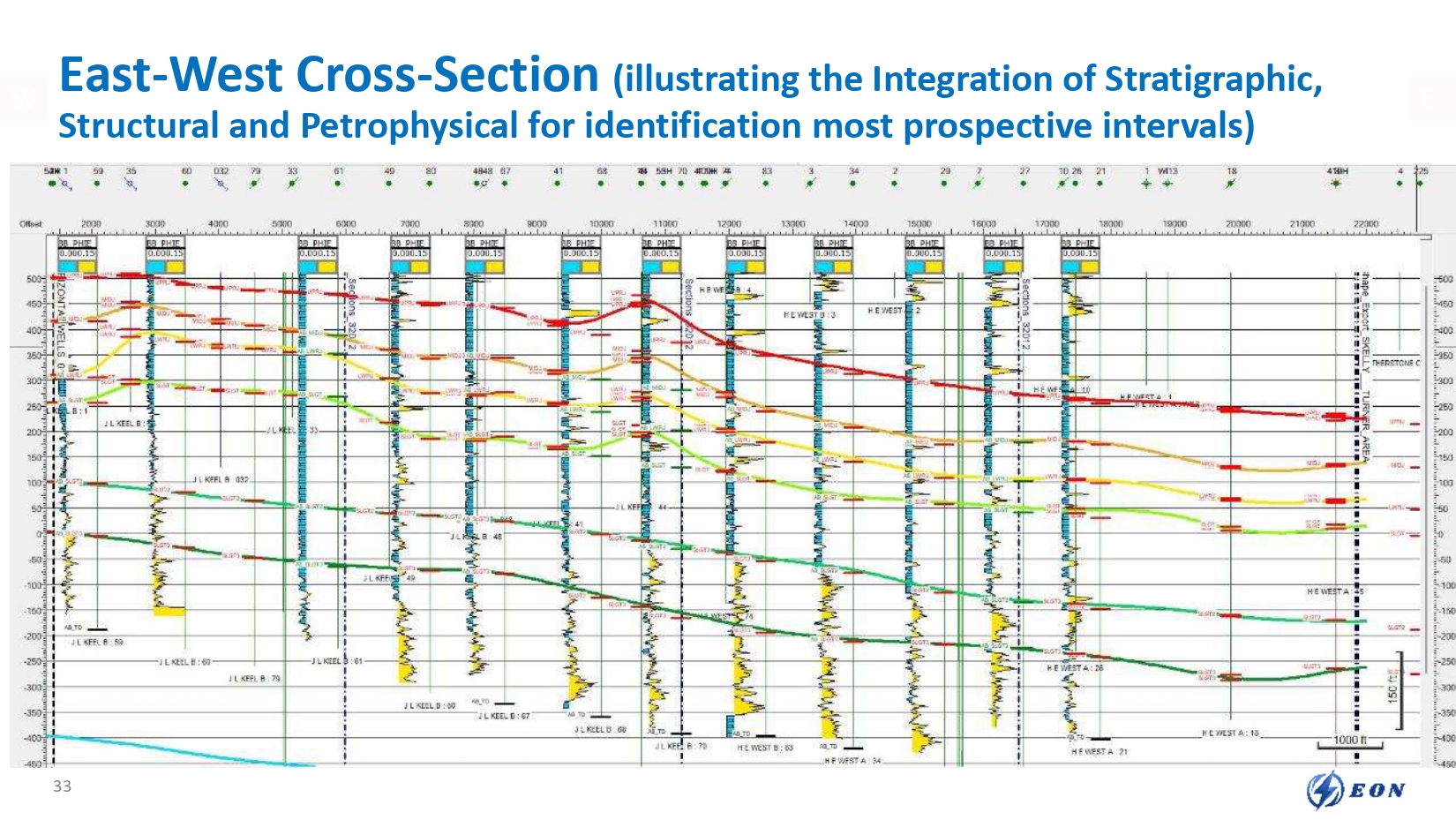 W 33 E East - West Cross - Section (illustrating the Integration of Stratigraphic, Structural and Petrophysical for identification most prospective intervals)