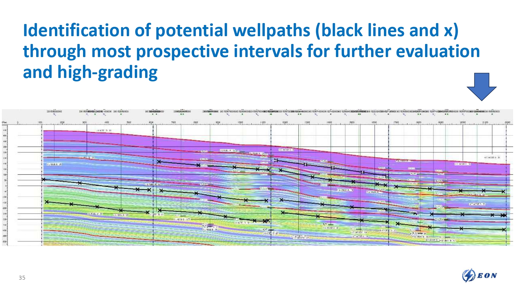 Identification of potential wellpaths (black lines and x) through most prospective intervals for further evaluation and high - grading 35