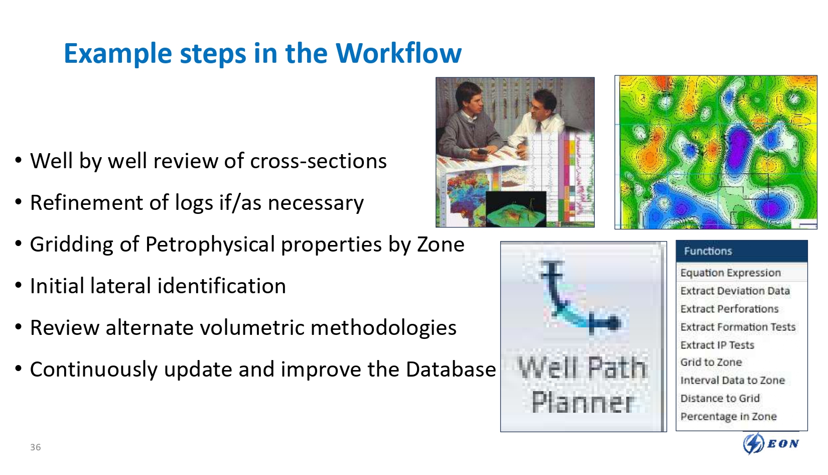 • Well by well review of cross - sections • Refinement of logs if/as necessary • Gridding of Petrophysical properties by Zone • Initial lateral identification • Review alternate volumetric methodologies • Continuously update and improve the Database Example steps in the Workflow 36