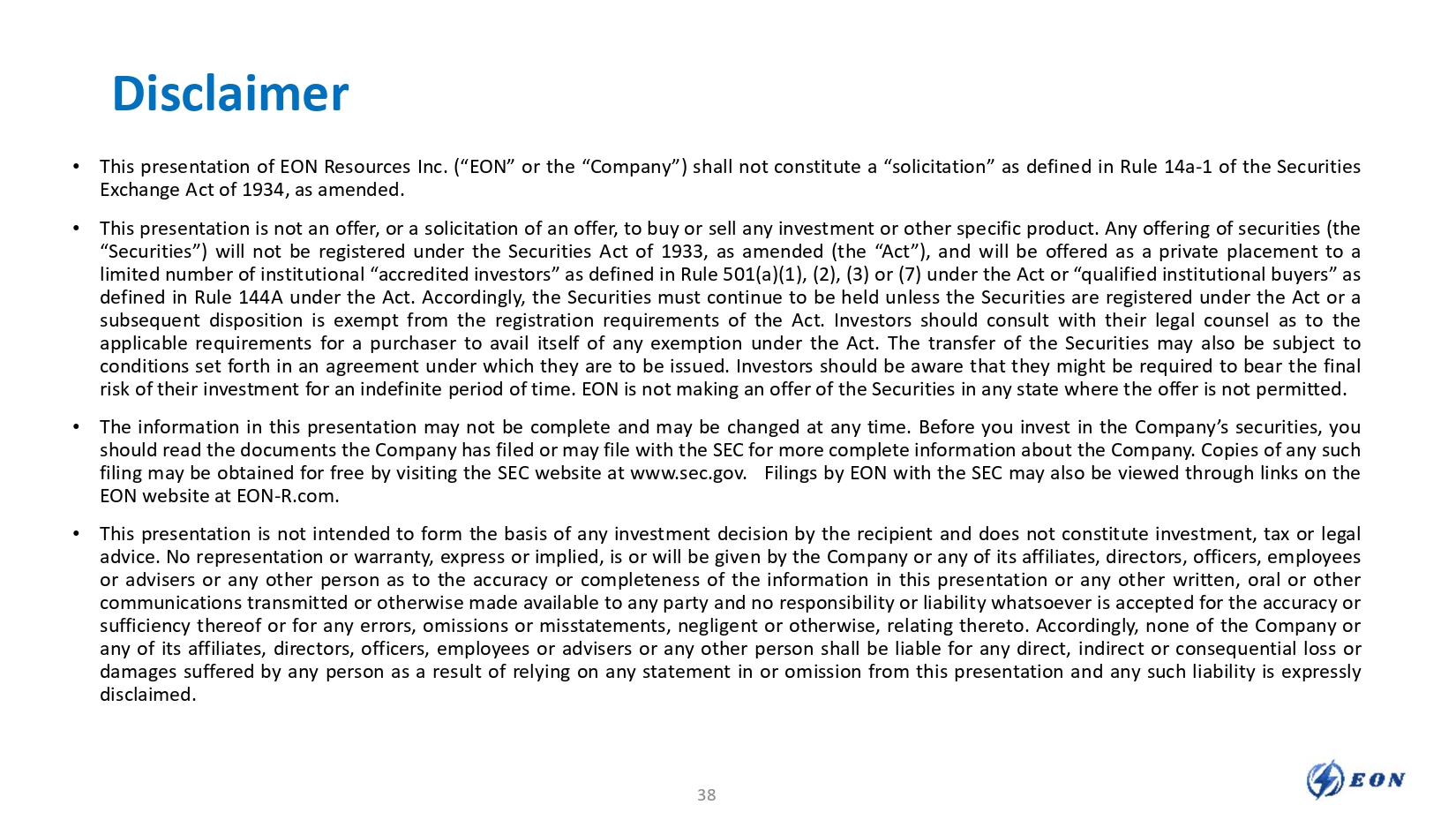Disclaimer • This presentation of EON Resources Inc . (“EON” or the “Company”) shall not constitute a “solicitation” as defined in Rule 14 a - 1 of the Securities Exchange Act of 1934 , as amended . • This presentation is not an offer, or a solicitation of an offer, to buy or sell any investment or other specific product . Any offering of securities (the “Securities”) will not be registered under the Securities Act of 1933 , as amended (the “Act”), and will be offered as a private placement to a limited number of institutional “accredited investors” as defined in Rule 501 (a)( 1 ), ( 2 ), ( 3 ) or ( 7 ) under the Act or “qualified institutional buyers” as defined in Rule 144 A under the Act . Accordingly, the Securities must continue to be held unless the Securities are registered under the Act or a subsequent disposition is exempt from the registration requirements of the Act . Investors should consult with their legal counsel as to the applicable requirements for a purchaser to avail itself of any exemption under the Act . The transfer of the Securities may also be subject to conditions set forth in an agreement under which they are to be issued . Investors should be aware that they might be required to bear the final risk of their investment for an indefinite period of time . EON is not making an offer of the Securities in any state where the offer is not permitted . • The information in this presentation may not be complete and may be changed at any time . Before you invest in the Company’s securities, you should read the documents the Company has filed or may file with the SEC for more complete information about the Company . Copies of any such filing may be obtained for free by visiting the SEC website at www . sec . gov . Filings by EON with the SEC may also be viewed through links on the EON website at EON - R . com . • This presentation is not intended to form the basis of any investment decision by the recipient and does not constitute investment, tax or legal advice . No representation or warranty, express or implied, is or will be given by the Company or any of its affiliates, directors, officers, employees or advisers or any other person as to the accuracy or completeness of the information in this presentation or any other written, oral or other communications transmitted or otherwise made available to any party and no responsibility or liability whatsoever is accepted for the accuracy or sufficiency thereof or for any errors, omissions or misstatements, negligent or otherwise, relating thereto . Accordingly, none of the Company or any of its affiliates, directors, officers, employees or advisers or any other person shall be liable for any direct, indirect or consequential loss or damages suffered by any person as a result of relying on any statement in or omission from this presentation and any such liability is expressly disclaimed . 38