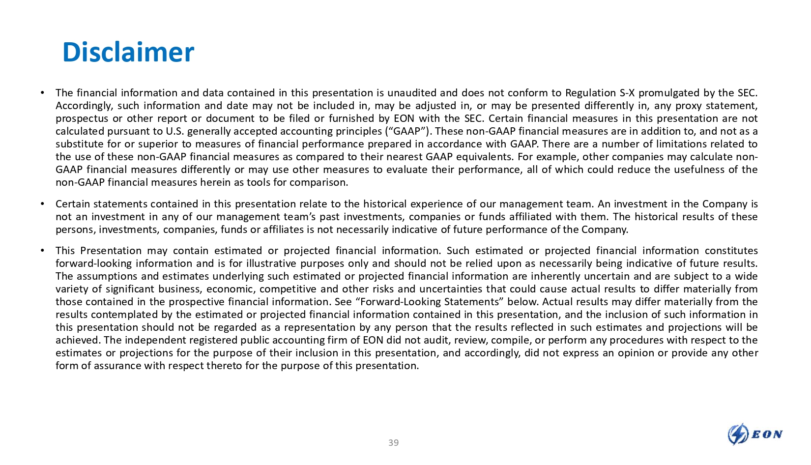 Disclaimer • The financial information and data contained in this presentation is unaudited and does not conform to Regulation S - X promulgated by the SEC . Accordingly, such information and date may not be included in, may be adjusted in, or may be presented differently in, any proxy statement, prospectus or other report or document to be filed or furnished by EON with the SEC . Certain financial measures in this presentation are not calculated pursuant to U . S . generally accepted accounting principles (“GAAP”) . These non - GAAP financial measures are in addition to, and not as a substitute for or superior to measures of financial performance prepared in accordance with GAAP . There are a number of limitations related to the use of these non - GAAP financial measures as compared to their nearest GAAP equivalents . For example, other companies may calculate non - GAAP financial measures differently or may use other measures to evaluate their performance, all of which could reduce the usefulness of the non - GAAP financial measures herein as tools for comparison . • Certain statements contained in this presentation relate to the historical experience of our management team . An investment in the Company is not an investment in any of our management team’s past investments, companies or funds affiliated with them . The historical results of these persons, investments, companies, funds or affiliates is not necessarily indicative of future performance of the Company . • This Presentation may contain estimated or projected financial information . Such estimated or projected financial information constitutes forward - looking information and is for illustrative purposes only and should not be relied upon as necessarily being indicative of future results . The assumptions and estimates underlying such estimated or projected financial information are inherently uncertain and are subject to a wide variety of significant business, economic, competitive and other risks and uncertainties that could cause actual results to differ materially from those contained in the prospective financial information . See “Forward - Looking Statements” below . Actual results may differ materially from the results contemplated by the estimated or projected financial information contained in this presentation, and the inclusion of such information in this presentation should not be regarded as a representation by any person that the results reflected in such estimates and projections will be achieved . The independent registered public accounting firm of EON did not audit, review, compile, or perform any procedures with respect to the estimates or projections for the purpose of their inclusion in this presentation, and accordingly, did not express an opinion or provide any other form of assurance with respect thereto for the purpose of this presentation . 39