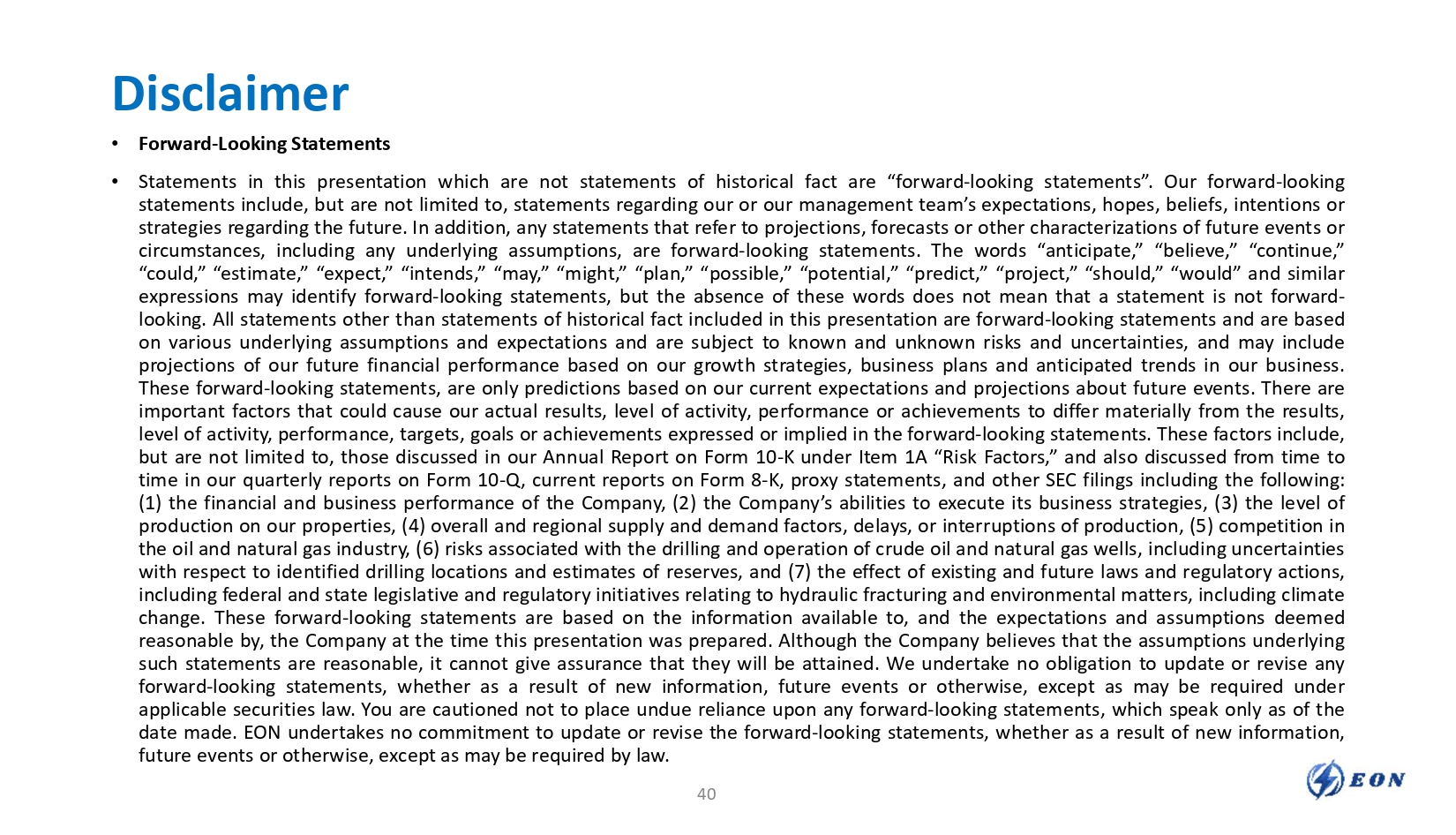 Disclaimer • Forward - Looking Statements • Statements in this presentation which are not statements of historical fact are “forward - looking statements” . Our forward - looking statements include, but are not limited to, statements regarding our or our management team’s expectations, hopes, beliefs, intentions or strategies regarding the future . In addition, any statements that refer to projections, forecasts or other characterizations of future events or circumstances, including any underlying assumptions, are forward - looking statements . The words “anticipate,” “believe,” “continue,” “could,” “estimate,” “expect,” “intends,” “may,” “might,” “plan,” “possible,” “potential,” “predict,” “project,” “should,” “would” and similar expressions may identify forward - looking statements, but the absence of these words does not mean that a statement is not forward - looking . All statements other than statements of historical fact included in this presentation are forward - looking statements and are based on various underlying assumptions and expectations and are subject to known and unknown risks and uncertainties, and may include projections of our future financial performance based on our growth strategies, business plans and anticipated trends in our business . These forward - looking statements, are only predictions based on our current expectations and projections about future events . There are important factors that could cause our actual results, level of activity, performance or achievements to differ materially from the results, level of activity, performance, targets, goals or achievements expressed or implied in the forward - looking statements . These factors include, but are not limited to, those discussed in our Annual Report on Form 10 - K under Item 1 A “Risk Factors,” and also discussed from time to time in our quarterly reports on Form 10 - Q, current reports on Form 8 - K, proxy statements, and other SEC filings including the following : ( 1 ) the financial and business performance of the Company, ( 2 ) the Company’s abilities to execute its business strategies, ( 3 ) the level of production on our properties, ( 4 ) overall and regional supply and demand factors, delays, or interruptions of production, ( 5 ) competition in the oil and natural gas industry, ( 6 ) risks associated with the drilling and operation of crude oil and natural gas wells, including uncertainties with respect to identified drilling locations and estimates of reserves, and ( 7 ) the effect of existing and future laws and regulatory actions, including federal and state legislative and regulatory initiatives relating to hydraulic fracturing and environmental matters, including climate change . These forward - looking statements are based on the information available to, and the expectations and assumptions deemed reasonable by, the Company at the time this presentation was prepared . Although the Company believes that the assumptions underlying such statements are reasonable, it cannot give assurance that they will be attained . We undertake no obligation to update or revise any forward - looking statements, whether as a result of new information, future events or otherwise, except as may be required under applicable securities law . You are cautioned not to place undue reliance upon any forward - looking statements, which speak only as of the date made . EON undertakes no commitment to update or revise the forward - looking statements, whether as a result of new information, future events or otherwise, except as may be required by law . 40