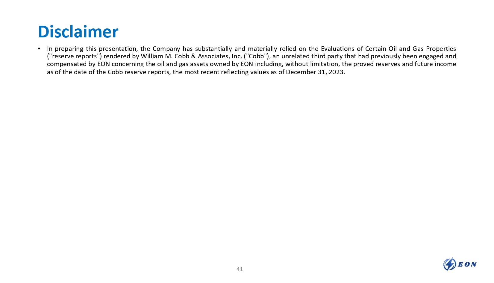 Disclaimer • In preparing this presentation, the Company has substantially and materially relied on the Evaluations of Certain Oil and Gas Properties ("reserve reports") rendered by William M . Cobb & Associates, Inc . ("Cobb"), an unrelated third party that had previously been engaged and compensated by EON concerning the oil and gas assets owned by EON including, without limitation, the proved reserves and future income as of the date of the Cobb reserve reports, the most recent reflecting values as of December 31 , 2023 . 41