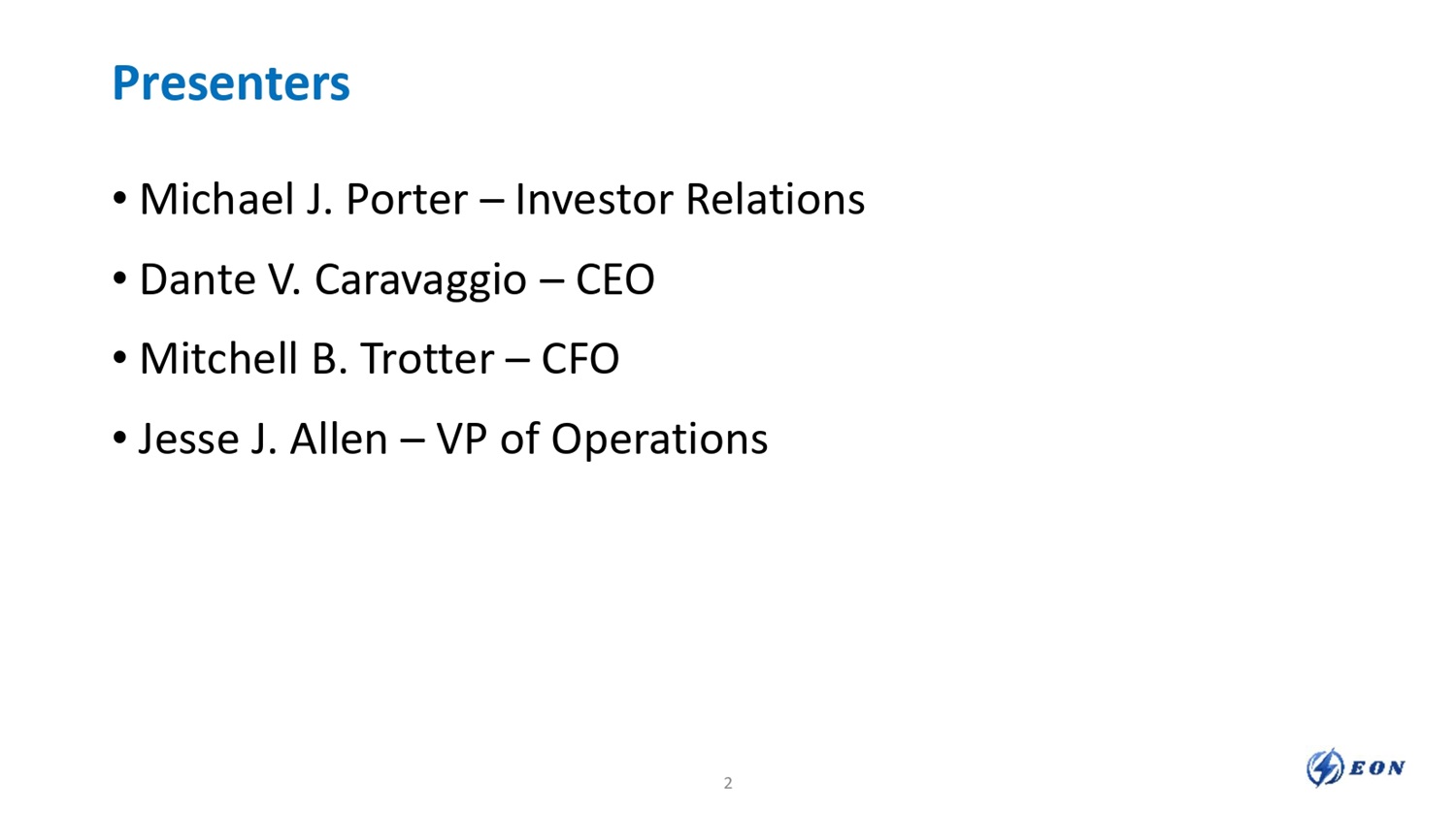 Presenters • Michael J. Porter – Investor Relations • Dante V. Caravaggio – CEO • Mitchell B. Trotter – CFO • Jesse J. Allen – VP of Operations 2