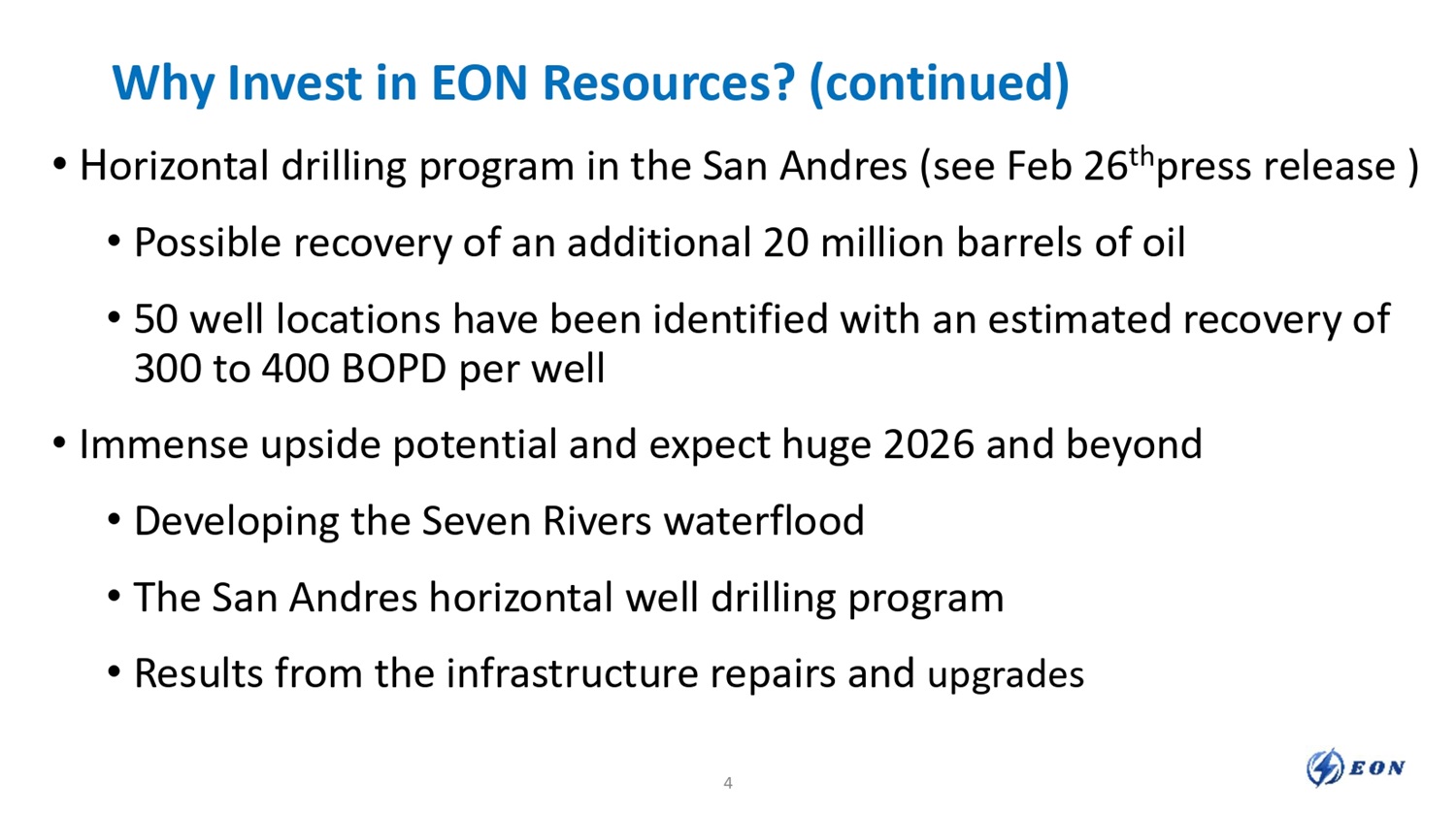 Why Invest in EON Resources? • World class Permian asset with 1 billion original barrels in place • Repaired and upgraded most of the field condition issues in 2024 • Agreement with Seller has huge benefits (see press release on Feb 11 th ) • Reduced the original $120 million purchase price to $60 million on $80 million asset • Eliminates approximately $40 million in debt and obligations • Additional 150 patterns to go for the proven reserves in the Seven Rivers • Over 200 workovers available to develop behind pipe potential 3
