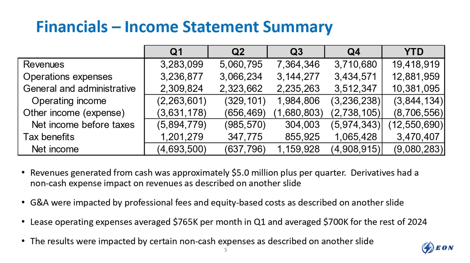 Financials – Income Statement Summary • Revenues generated from cash was approximately $5.0 million plus per quarter. Derivatives had a non - cash expense impact on revenues as described on another slide • G&A were impacted by professional fees and equity - based costs as described on another slide • Lease operating expenses averaged $765K per month in Q1 and averaged $700K for the rest of 2024 • The results were impacted by certain non - cash expenses as described on another slide 5 YTD Q4 Q3 Q2 Q1 19,418,919 3,710,680 7,364,346 5,060,795 3,283,099 Revenues 12,881,959 3,434,571 3,144,277 3,066,234 3,236,877 Operations expenses 10,381,095 3,512,347 2,235,263 2,323,662 2,309,824 General and administrative (3,844,134) (3,236,238) 1,984,806 (329,101) (2,263,601) Operating income (8,706,556) (2,738,105) (1,680,803) (656,469) (3,631,178) Other income (expense) (12,550,690) (5,974,343) 304,003 (985,570) (5,894,779) Net income before taxes 3,470,407 1,065,428 855,925 347,775 1,201,279 Tax benefits (9,080,283) (4,908,915) 1,159,928 (637,796) (4,693,500) Net income