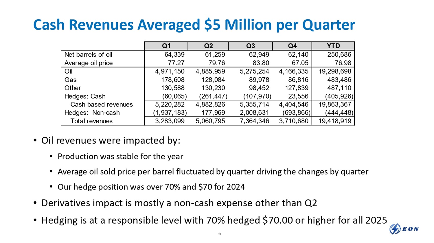 Cash Revenues Averaged $5 Million per Quarter • Oil revenues were impacted by: • Production was stable for the year • Average oil sold price per barrel fluctuated by quarter driving the changes by quarter • Our hedge position was over 70% and $70 for 2024 • Derivatives impact is mostly a non - cash expense other than Q2 • Hedging is at a responsible level with 70% hedged $70.00 or higher for all 2025 YTD Q4 Q3 Q2 Q1 250,686 62,140 62,949 61,259 64,339 Net barrels of oil 76.98 67.05 83.80 79.76 77.27 Average oil price 19,298,698 4,166,335 5,275,254 4,885,959 4,971,150 Oil 483,486 86,816 89,978 128,084 178,608 Gas 487,110 127,839 98,452 130,230 130,588 Other (405,926) 23,556 (107,970) (261,447) (60,065) Hedges: Cash 19,863,367 4,404,546 5,355,714 4,882,826 5,220,282 Cash based revenues (444,448) (693,866) 2,008,631 177,969 (1,937,183) Hedges: Non - cash 19,418,919 3,710,680 7,364,346 5,060,795 3,283,099 Total revenues 6