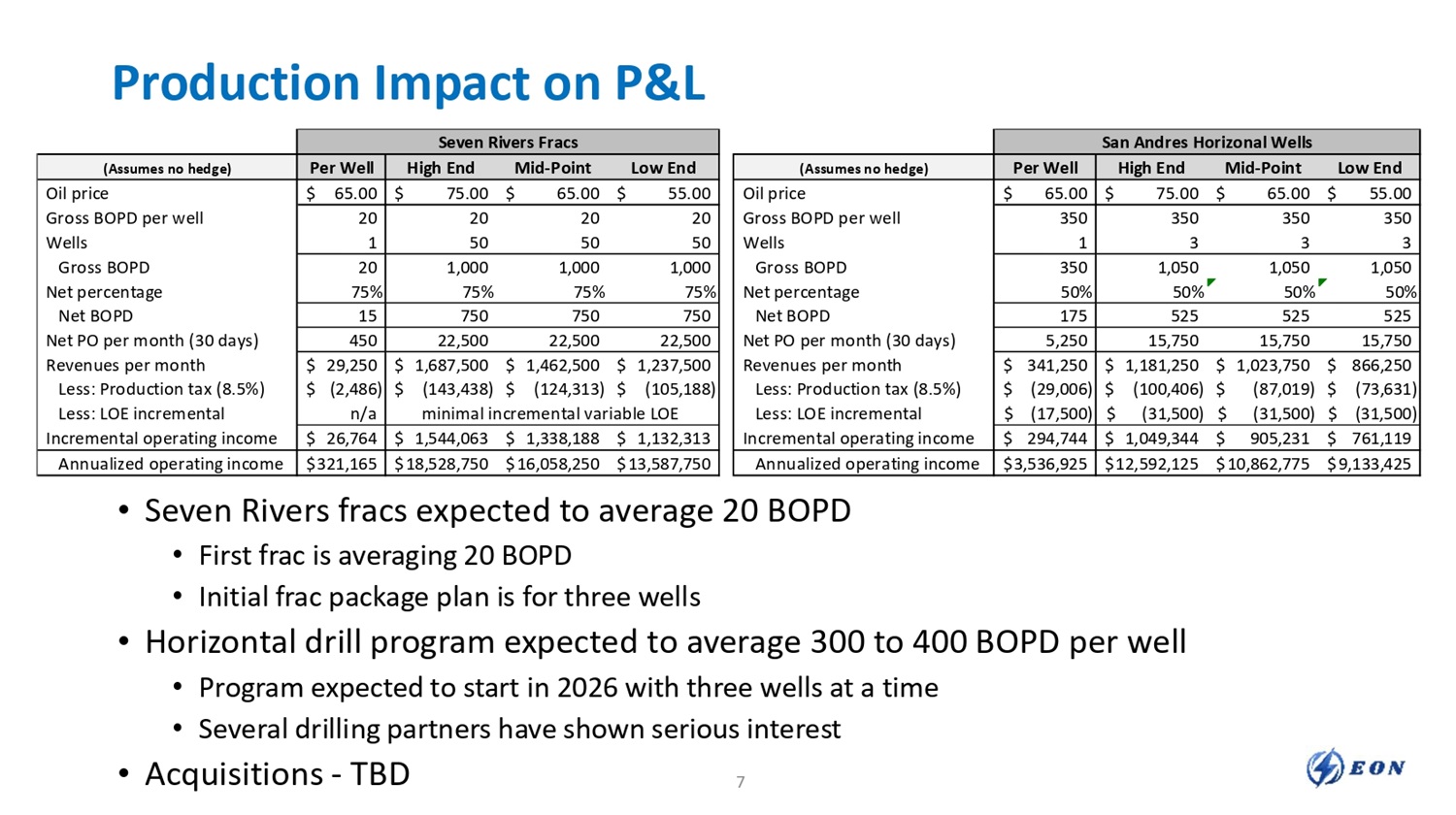 Production Impact on P&L • Seven Rivers fracs expected to average 20 BOPD • First frac is averaging 20 BOPD • Initial frac package plan is for three wells • Horizontal drill program expected to average 300 to 400 BOPD per well • Program expected to start in 2026 with three wells at a time • Several drilling partners have shown serious interest • Acquisitions - TBD 7 Seven Rivers Fracs Low End Mid - Point High End Per Well (Assumes no hedge) $ 55.00 $ 65.00 $ 75.00 $ 65.00 Oil price 20 20 20 20 Gross BOPD per well 50 50 50 1 Wells 1,000 1,000 1,000 20 Gross BOPD 75% 75% 75% 75% Net percentage 750 750 750 15 Net BOPD 22,500 22,500 22,500 450 Net PO per month (30 days) $ 1,687,500 $ 1,462,500 $ 1,237,500 $ 29,250 Revenues per month $ (143,438) $ (124,313) $ (105,188) $ (2,486) Less: Production tax (8.5%) minimal incremental variable LOE n/a Less: LOE incremental $ 1,132,313 $ 1,338,188 $ 1,544,063 $ 26,764 Incremental operating income $ 13,587,750 $ 16,058,250 $ 18,528,750 $ 321,165 Annualized operating income San Andres Horizonal Wells Low End Mid - Point High End Per Well (Assumes no hedge) $ 55.00 $ 65.00 $ 75.00 $ 65.00 Oil price 350 350 350 350 Gross BOPD per well 3 3 3 1 Wells 1,050 1,050 1,050 350 Gross BOPD 50% 50% 50% 50% Net percentage 525 525 525 175 Net BOPD 15,750 15,750 15,750 5,250 Net PO per month (30 days) $ 1,181,250 $ 1,023,750 $ 866,250 $ 341,250 Revenues per month $ (100,406) $ (87,019) $ (73,631) $ (29,006) Less: Production tax (8.5%) $ (31,500) $ (31,500) $ (31,500) $ (17,500) Less: LOE incremental $ 761,119 $ 905,231 $ 1,049,344 $ 294,744 Incremental operating income $ 9,133,425 $ 10,862,775 $ 12,592,125 $ 3,536,925 Annualized operating income