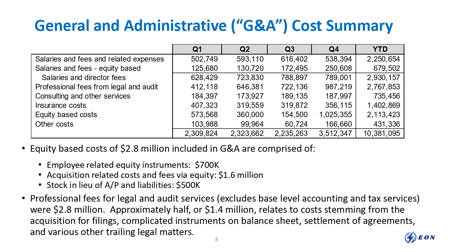 General and Administrative (“G&A”) Cost Summary • Equity based costs of $2.8 million included in G&A are comprised of: • Employee related equity instruments: $700K • Acquisition related costs and fees via equity: $1.6 million • Stock in lieu of A/P and liabilities: $500K • Professional fees for legal and audit services (excludes base level accounting and tax services) were $2.8 million. Approximately half, or $1.4 million, relates to costs stemming from the acquisition for filings, complicated instruments on balance sheet, settlement of agreements, and various other trailing legal matters. 8 YTD Q4 Q3 Q2 Q1 2,250,654 538,394 616,402 593,110 502,749 Salaries and fees and related expenses 679,502 250,608 172,495 130,720 125,680 Salaries and fees - equity based 2,930,157 789,001 788,897 723,830 628,429 Salaries and director fees 2,767,853 987,219 722,136 646,381 412,118 Professional fees from legal and audit 735,456 187,997 189,135 173,927 184,397 Consulting and other services 1,402,869 356,115 319,872 319,559 407,323 Insurance costs 2,113,423 1,025,355 154,500 360,000 573,568 Equity based costs 431,336 166,660 60,724 99,964 103,988 Other costs 10,381,095 3,512,347 2,235,263 2,323,662 2,309,824