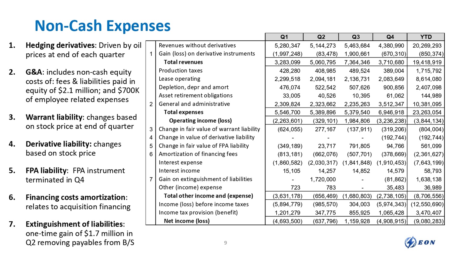 Non - Cash Expenses 1. Hedging derivatives : Driven by oil prices at end of each quarter 2. G&A : includes non - cash equity costs of: fees & liabilities paid in equity of $2.1 million; and $700K of employee related expenses 3. Warrant liability : changes based on stock price at end of quarter 4. Derivative liability: changes based on stock price 5. FPA liability : FPA instrument terminated in Q4 6. Financing costs amortization : relates to acquisition financing 7. Extinguishment of liabilities : one - time gain of $1.7 million in Q2 removing payables from B/S 9 YTD Q4 Q3 Q2 Q1 20,269,293 4,380,990 5,463,684 5,144,273 5,280,347 Revenues without derivatives Gain (loss) on derivative instruments Total revenues Production taxes Lease operating Depletion, depr and amort Asset retirement obligations General and administrative Total expenses Operating income (loss) Change in fair value of warrant liability Change in value of derivative liability Change in fair value of FPA liability Amortization of financing fees Interest expense Interest income Gain on extinguishment of liabilities Other (income) expense Total other income and (expense) Income (loss) before income taxes Income tax provision (benefit) Net income (loss) (850,374) (670,310) 1,900,661 (83,478) (1,997,248) 1 19,418,919 3,710,680 7,364,346 5,060,795 3,283,099 1,715,792 8,614,080 2,407,098 144,989 10,381,095 389,004 2,083,649 900,856 61,062 3,512,347 489,524 2,136,731 507,626 10,395 2,235,263 408,985 2,094,181 522,542 40,526 2,323,662 428,280 2,299,518 476,074 33,005 2,309,824 2 23,263,054 6,946,918 5,379,540 5,389,896 5,546,700 (3,844,134) (3,236,238) 1,984,806 (329,101) (2,263,601) (804,004) (319,206) (137,911) 277,167 (624,055) 3 (192,744) (192,744) - - - 4 561,099 94,766 791,805 23,717 (349,189) 5 (2,361,627) (378,669) (507,701) (662,076) (813,181) 6 (7,643,199) (1,910,453) (1,841,848) (2,030,317) (1,860,582) 58,793 14,579 14,852 14,257 15,105 1,638,138 (81,862) - 1,720,000 - 7 36,989 35,483 - 783 723 (8,706,556) (2,738,105) (1,680,803) (656,469) (3,631,178) (12,550,690) (5,974,343) 304,003 (985,570) (5,894,779) 3,470,407 1,065,428 855,925 347,775 1,201,279 (9,080,283) (4,908,915) 1,159,928 (637,796) (4,693,500)