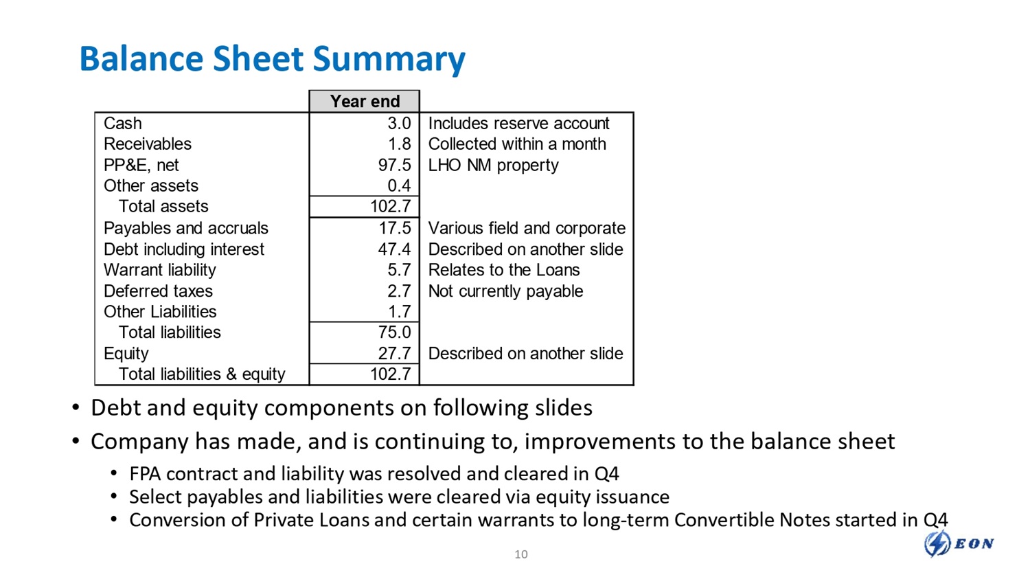 Balance Sheet Summary • Debt and equity components on following slides • Company has made, and is continuing to, improvements to the balance sheet • FPA contract and liability was resolved and cleared in Q4 • Select payables and liabilities were cleared via equity issuance • Conversion of Private Loans and certain warrants to long - term Convertible Notes started in Q4 10 Year end Includes reserve account 3.0 Cash Collected within a month 1.8 Receivables LHO NM property 97.5 PP&E, net 0.4 Other assets 102.7 Total assets Various field and corporate 17.5 Payables and accruals Described on another slide 47.4 Debt including interest Relates to the Loans 5.7 Warrant liability Not currently payable 2.7 Deferred taxes 1.7 Other Liabilities 75.0 Total liabilities Described on another slide 27.7 Equity 102.7 Total liabilities & equity