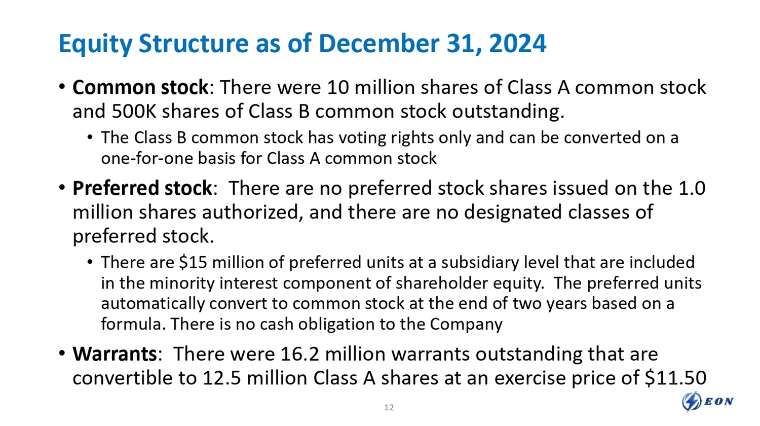 Equity Structure as of December 31, 2024 • Common stock : There were 10 million shares of Class A common stock and 500K shares of Class B common stock outstanding. • The Class B common stock has voting rights only and can be converted on a one - for - one basis for Class A common stock • Preferred stock : There are no preferred stock shares issued on the 1.0 million shares authorized, and there are no designated classes of preferred stock. • There are $15 million of preferred units at a subsidiary level that are included in the minority interest component of shareholder equity. The preferred units automatically convert to common stock at the end of two years based on a formula. There is no cash obligation to the Company • Warrants : There were 16.2 million warrants outstanding that are convertible to 12.5 million Class A shares at an exercise price of $11.50 12