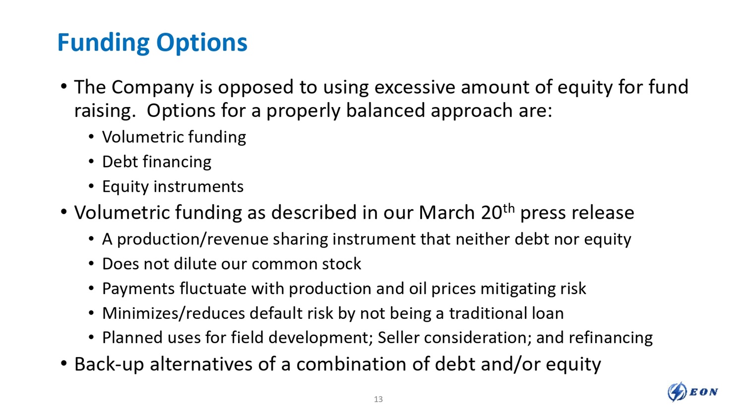 Funding Options • The Company is opposed to using excessive amount of equity for fund raising. Options for a properly balanced approach are: • Volumetric funding • Debt financing • Equity instruments • Volumetric funding as described in our March 20 th press release • A production/revenue sharing instrument that neither debt nor equity • Does not dilute our common stock • Payments fluctuate with production and oil prices mitigating risk • Minimizes/reduces default risk by not being a traditional loan • Planned uses for field development; Seller consideration; and refinancing • Back - up alternatives of a combination of debt and/or equity 13