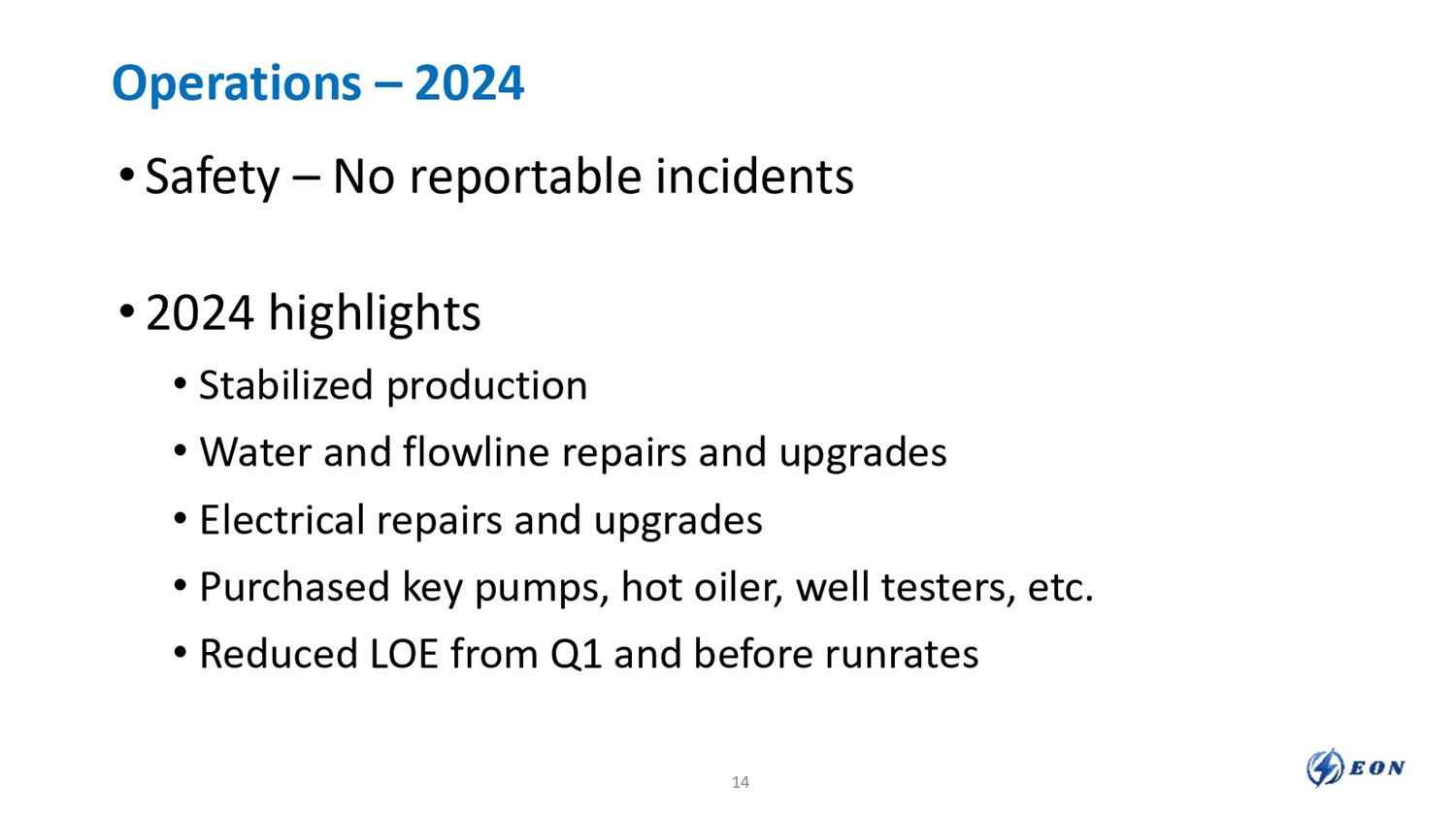Operations – 2024 • Safety – No reportable incidents • 2024 highlights • Stabilized production • Water and flowline repairs and upgrades • Electrical repairs and upgrades • Purchased key pumps, hot oiler, well testers, etc. • Reduced LOE from Q1 and before runrates 14