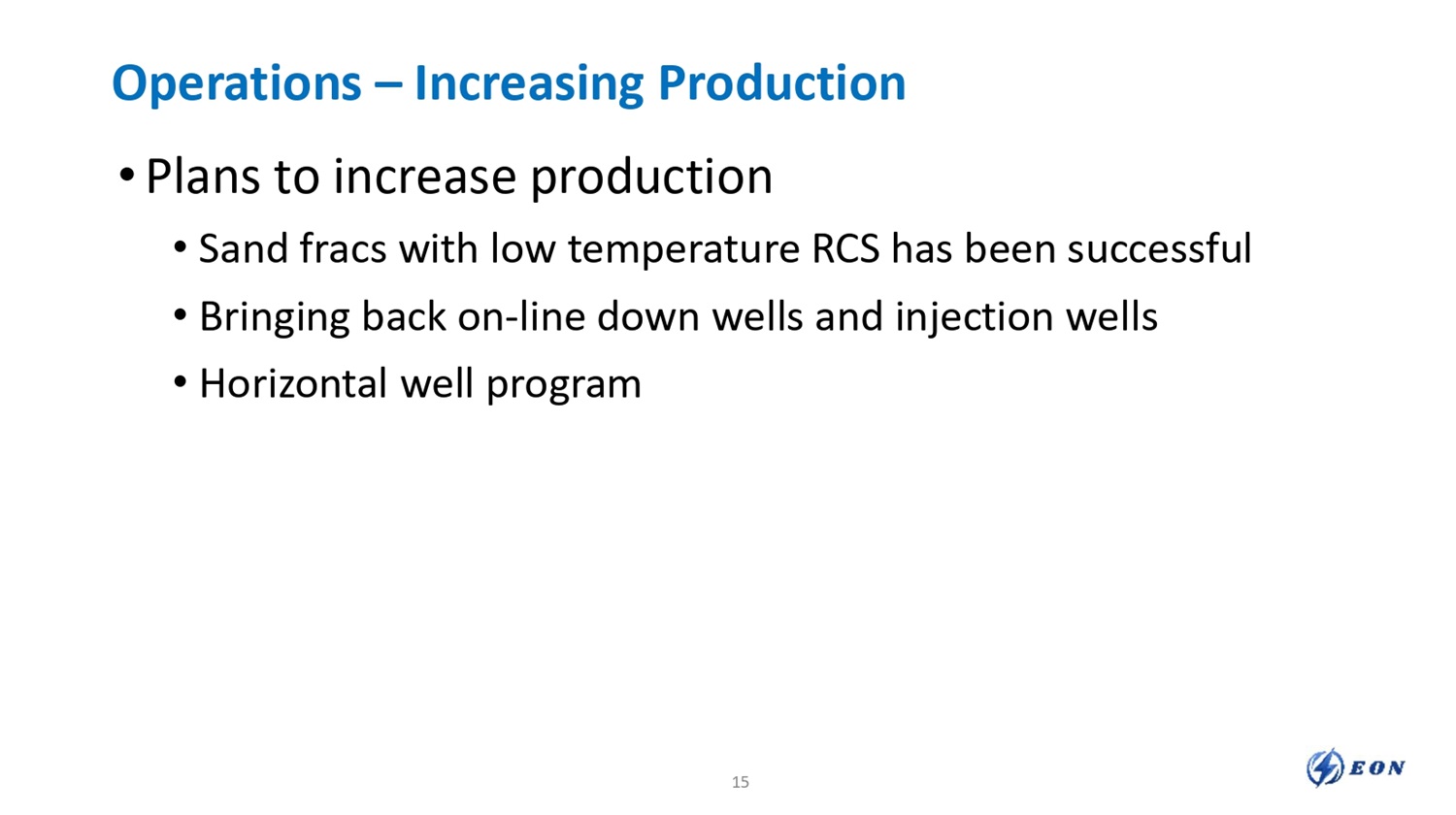 Operations – Increasing Production • Plans to increase production • Sand fracs with low temperature RCS has been successful • Bringing back on - line down wells and injection wells • Horizontal well program 15