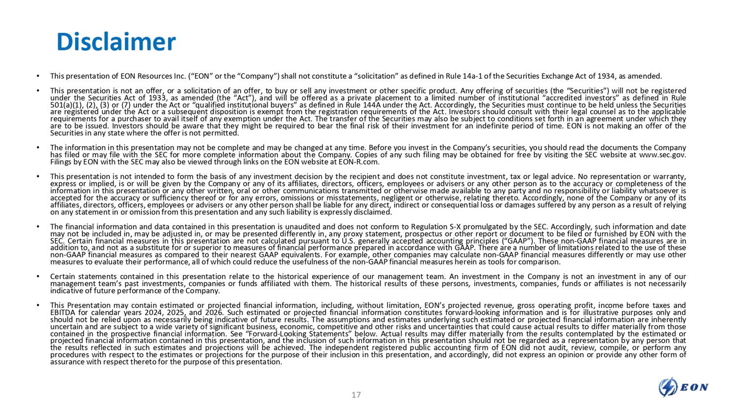 Disclaimer • This presentation of EON Resources Inc. (“EON” or the “Company”) shall not constitute a “solicitation” as defined in Rule 14a - 1 of the Securities Exchange Act of 1934, as amended. • This presentation is not an offer, or a solicitation of an offer, to buy or sell any investment or other specific product. Any offering of securities (the “Securities”) will not be registered under the Securities Act of 1933, as amended (the “Act”), and will be offered as a private placement to a limited number of institutional “accredited investors” as defined in Rule 501(a)(1), (2), (3) or (7) under the Act or “qualified institutional buyers” as defined in Rule 144A under the Act. Accordingly, the Securities must continue to be held unless the Securities are registered under the Act or a subsequent disposition is exempt from the registration requirements of the Act. Investors should consult with their legal counsel as to the applicable requirements for a purchaser to avail itself of any exemption under the Act. The transfer of the Securities may also be subject to conditions set forth in an agreement under which they are to be issued. Investors should be aware that they might be required to bear the final risk of their investment for an indefinite period of time. EON is not making an offer of the Securities in any state where the offer is not permitted. • The information in this presentation may not be complete and may be changed at any time. Before you invest in the Company’s securities, you should read the documents the Company has filed or may file with the SEC for more complete information about the Company. Copies of any such filing may be obtained for free by visiting the SEC website at www.sec.gov. Filings by EON with the SEC may also be viewed through links on the EON website at EON - R.com. • This presentation is not intended to form the basis of any investment decision by the recipient and does not constitute investment, tax or legal advice. No representation or warranty, express or implied, is or will be given by the Company or any of its affiliates, directors, officers, employees or advisers or any other person as to the accuracy or completeness of the information in this presentation or any other written, oral or other communications transmitted or otherwise made available to any party and no responsibility or liability whatsoever is accepted for the accuracy or sufficiency thereof or for any errors, omissions or misstatements, negligent or otherwise, relating thereto. Accordingly, none of the Company or any of its affiliates, directors, officers, employees or advisers or any other person shall be liable for any direct, indirect or consequential loss or damages suffered by any person as a result of relying on any statement in or omission from this presentation and any such liability is expressly disclaimed. • The financial information and data contained in this presentation is unaudited and does not conform to Regulation S - X promulgated by the SEC. Accordingly, such information and date may not be included in, may be adjusted in, or may be presented differently in, any proxy statement, prospectus or other report or document to be filed or furnished by EON with the SEC. Certain financial measures in this presentation are not calculated pursuant to U.S. generally accepted accounting principles (“GAAP”). These non - GAAP financial measures are in addition to, and not as a substitute for or superior to measures of financial performance prepared in accordance with GAAP. There are a number of limitations related to the use of these non - GAAP financial measures as compared to their nearest GAAP equivalents. For example, other companies may calculate non - GAAP financial measures differently or may use other measures to evaluate their performance, all of which could reduce the usefulness of the non - GAAP financial measures herein as tools for comparison. • Certain statements contained in this presentation relate to the historical experience of our management team. An investment in the Company is not an investment in any of our management team’s past investments, companies or funds affiliated with them. The historical results of these persons, investments, companies, funds or affiliates is not necessarily indicative of future performance of the Company. • This Presentation may contain estimated or projected financial information, including, without limitation, EON’s projected revenue, gross operating profit, income before taxes and EBITDA for calendar years 2024, 2025, and 2026. Such estimated or projected financial information constitutes forward - looking information and is for illustrative purposes only and should not be relied upon as necessarily being indicative of future results. The assumptions and estimates underlying such estimated or projected financial information are inherently uncertain and are subject to a wide variety of significant business, economic, competitive and other risks and uncertainties that could cause actual results to differ materially from those contained in the prospective financial information. See “Forward - Looking Statements” below. Actual results may differ materially from the results contemplated by the estimated or projected financial information contained in this presentation, and the inclusion of such information in this presentation should not be regarded as a representation by any person that the results reflected in such estimates and projections will be achieved. The independent registered public accounting firm of EON did not audit, review, compile, or perform any procedures with respect to the estimates or projections for the purpose of their inclusion in this presentation, and accordingly, did not express an opinion or provide any other form of assurance with respect thereto for the purpose of this presentation. 17