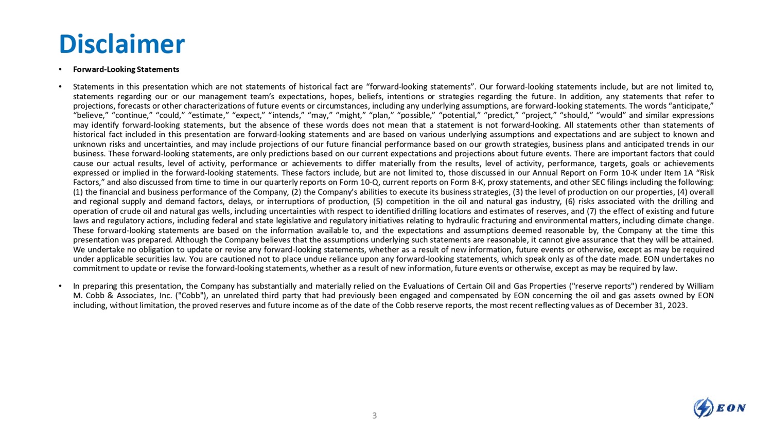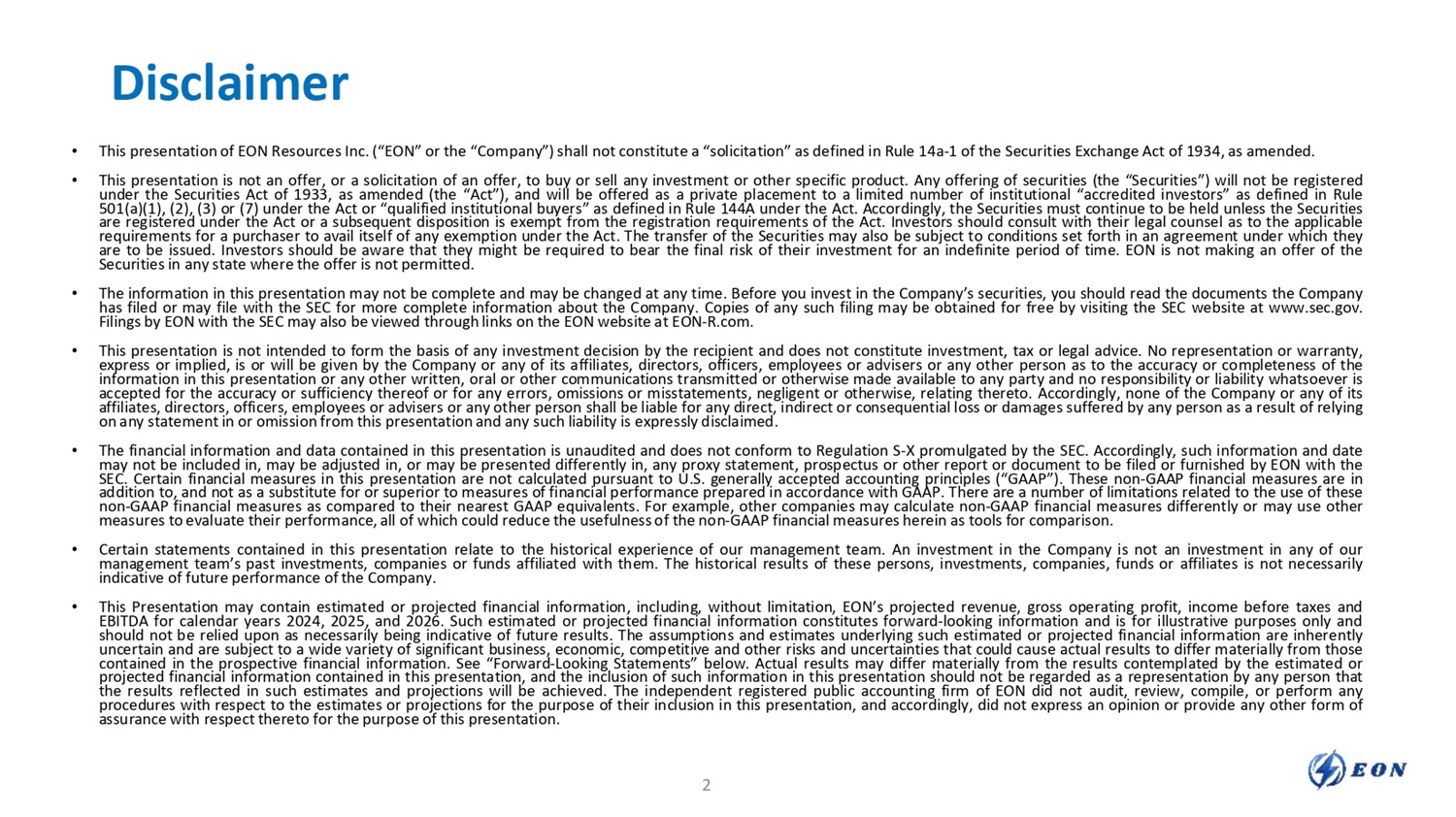 Disclaimer • This presentation of EON Resources Inc. (“EON” or the “Company”) shall not constitute a “solicitation” as defined in Rule 14a - 1 of the Securities Exchange Act of 1934, as amended. • This presentation is not an offer, or a solicitation of an offer, to buy or sell any investment or other specific product. Any offering of securities (the “Securities”) will not be registered under the Securities Act of 1933, as amended (the “Act”), and will be offered as a private placement to a limited number of institutional “accredited investors” as defined in Rule 501(a)(1), (2), (3) or (7) under the Act or “qualified institutional buyers” as defined in Rule 144A under the Act. Accordingly, the Securities must continue to be held unless the Securities are registered under the Act or a subsequent disposition is exempt from the registration requirements of the Act. Investors should consult with their legal counsel as to the applicable requirements for a purchaser to avail itself of any exemption under the Act. The transfer of the Securities may also be subject to conditions set forth in an agreement under which they are to be issued. Investors should be aware that they might be required to bear the final risk of their investment for an indefinite period of time. EON is not making an offer of the Securities in any state where the offer is not permitted. • The information in this presentation may not be complete and may be changed at any time. Before you invest in the Company’s securities, you should read the documents the Company has filed or may file with the SEC for more complete information about the Company. Copies of any such filing may be obtained for free by visiting the SEC website at www.sec.gov. Filings by EON with the SEC may also be viewed through links on the EON website at EON - R.com. • This presentation is not intended to form the basis of any investment decision by the recipient and does not constitute investment, tax or legal advice. No representation or warranty, express or implied, is or will be given by the Company or any of its affiliates, directors, officers, employees or advisers or any other person as to the accuracy or completeness of the information in this presentation or any other written, oral or other communications transmitted or otherwise made available to any party and no responsibility or liability whatsoever is accepted for the accuracy or sufficiency thereof or for any errors, omissions or misstatements, negligent or otherwise, relating thereto. Accordingly, none of the Company or any of its affiliates, directors, officers, employees or advisers or any other person shall be liable for any direct, indirect or consequential loss or damages suffered by any person as a result of relying on any statement in or omission from this presentation and any such liability is expressly disclaimed. • The financial information and data contained in this presentation is unaudited and does not conform to Regulation S - X promulgated by the SEC. Accordingly, such information and date may not be included in, may be adjusted in, or may be presented differently in, any proxy statement, prospectus or other report or document to be filed or furnished by EON with the SEC. Certain financial measures in this presentation are not calculated pursuant to U.S. generally accepted accounting principles (“GAAP”). These non - GAAP financial measures are in addition to, and not as a substitute for or superior to measures of financial performance prepared in accordance with GAAP. There are a number of limitations related to the use of these non - GAAP financial measures as compared to their nearest GAAP equivalents. For example, other companies may calculate non - GAAP financial measures differently or may use other measures to evaluate their performance, all of which could reduce the usefulness of the non - GAAP financial measures herein as tools for comparison. • Certain statements contained in this presentation relate to the historical experience of our management team. An investment in the Company is not an investment in any of our management team’s past investments, companies or funds affiliated with them. The historical results of these persons, investments, companies, funds or affiliates is not necessarily indicative of future performance of the Company. • This Presentation may contain estimated or projected financial information, including, without limitation, EON’s projected revenue, gross operating profit, income before taxes and EBITDA for calendar years 2024, 2025, and 2026. Such estimated or projected financial information constitutes forward - looking information and is for illustrative purposes only and should not be relied upon as necessarily being indicative of future results. The assumptions and estimates underlying such estimated or projected financial information are inherently uncertain and are subject to a wide variety of significant business, economic, competitive and other risks and uncertainties that could cause actual results to differ materially from those contained in the prospective financial information. See “Forward - Looking Statements” below. Actual results may differ materially from the results contemplated by the estimated or projected financial information contained in this presentation, and the inclusion of such information in this presentation should not be regarded as a representation by any person that the results reflected in such estimates and projections will be achieved. The independent registered public accounting firm of EON did not audit, review, compile, or perform any procedures with respect to the estimates or projections for the purpose of their inclusion in this presentation, and accordingly, did not express an opinion or provide any other form of assurance with respect thereto for the purpose of this presentation. 2