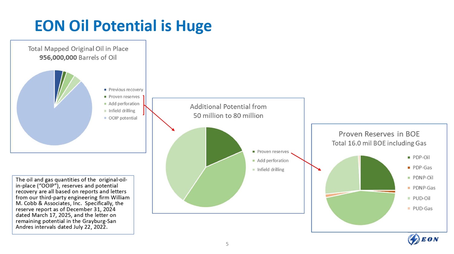 EON Oil Potential is Huge The oil and gas quantities of the original - oil - in - place (“OOIP”), reserves and potential recovery are all based on reports and letters from our third - party engineering firm William M. Cobb & Associates, Inc. Specifically, the reserve report as of December 31, 2024 dated March 17, 2025, and the letter on remaining potential in the Grayburg - San Andres intervals dated July 22, 2022. 5