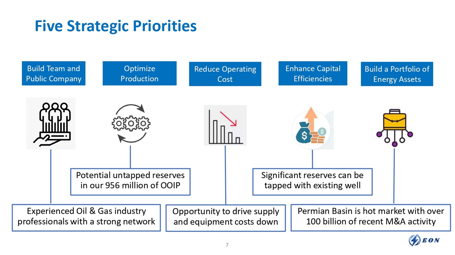 Five Strategic Priorities Build Team and Public Company Build Team and Public Company Optimize Production Optimize Production Reduce Operating Cost Reduce Operating Cost Enhance Capital Efficiencies Enhance Capital Efficiencies Build a Portfolio of Energy Assets Build a Portfolio of Energy Assets Experienced Oil & Gas industry professionals with a strong network Potential untapped reserves in our 956 million of OOIP Opportunity to drive supply and equipment costs down Significant reserves can be tapped with existing well Permian Basin is hot market with over 100 billion of recent M&A activity 7
