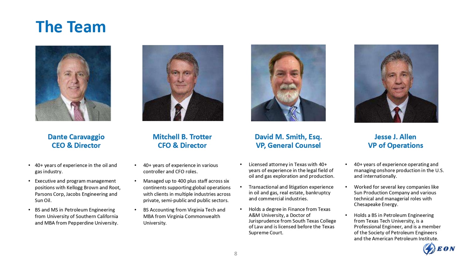 The Team Dante Caravaggio CEO & Director Mitchell B. Trotter CFO & Director David M. Smith, Esq. VP, General Counsel Jesse J. Allen VP of Operations • 40+ years of experience in the oil and gas industry. • Executive and program management positions with Kellogg Brown and Root, Parsons Corp, Jacobs Engineering and Sun Oil. • BS and MS in Petroleum Engineering from University of Southern California and MBA from Pepperdine University. • 40 + years of experience in various controller and CFO roles . • Managed up to 400 plus staff across six continents supporting global operations with clients in multiple industries across private, semi - public and public sectors . • BS Accounting from Virginia Tech and MBA from Virginia Commonwealth University. • Licensed attorney in Texas with 40+ years of experience in the legal field of oil and gas exploration and production. • Transactional and litigation experience in oil and gas, real estate, bankruptcy and commercial industries. • Holds a degree in Finance from Texas A&M University, a Doctor of Jurisprudence from South Texas College of Law and is licensed before the Texas Supreme Court. • 40+ years of experience operating and managing onshore production in the U.S. and internationally. • Worked for several key companies like Sun Production Company and various technical and managerial roles with Chesapeake Energy. • Holds a BS in Petroleum Engineering from Texas Tech University, is a Professional Engineer, and is a member of the Society of Petroleum Engineers and the American Petroleum Institute. 8