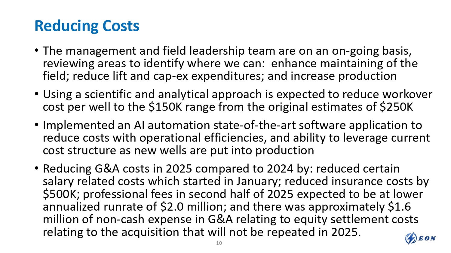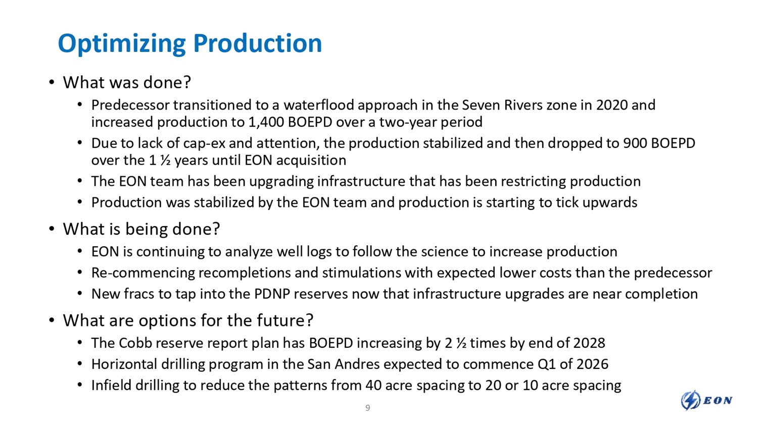 Optimizing Production • What was done? • Predecessor transitioned to a waterflood approach in the Seven Rivers zone in 2020 and increased production to 1,400 BOEPD over a two - year period • Due to lack of cap - ex and attention, the production stabilized and then dropped to 900 BOEPD over the 1 ½ years until EON acquisition • The EON team has been upgrading infrastructure that has been restricting production • Production was stabilized by the EON team and production is starting to tick upwards • What is being done? • EON is continuing to analyze well logs to follow the science to increase production • Re - commencing recompletions and stimulations with expected lower costs than the predecessor • New fracs to tap into the PDNP reserves now that infrastructure upgrades are near completion • What are options for the future? • The Cobb reserve report plan has BOEPD increasing by 2 ½ times by end of 2028 • Horizontal drilling program in the San Andres expected to commence Q1 of 2026 • Infield drilling to reduce the patterns from 40 acre spacing to 20 or 10 acre spacing 9