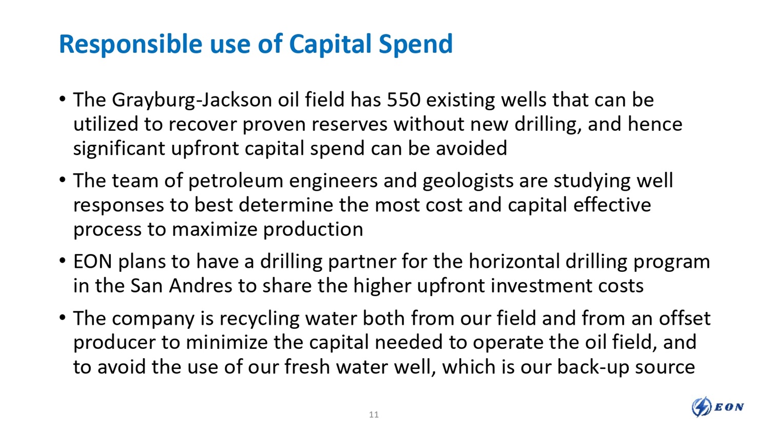Responsible use of Capital Spend • The Grayburg - Jackson oil field has 550 existing wells that can be utilized to recover proven reserves without new drilling, and hence significant upfront capital spend can be avoided • The team of petroleum engineers and geologists are studying well responses to best determine the most cost and capital effective process to maximize production • EON plans to have a drilling partner for the horizontal drilling program in the San Andres to share the higher upfront investment costs • The company is recycling water both from our field and from an offset producer to minimize the capital needed to operate the oil field, and to avoid the use of our fresh water well, which is our back - up source 11