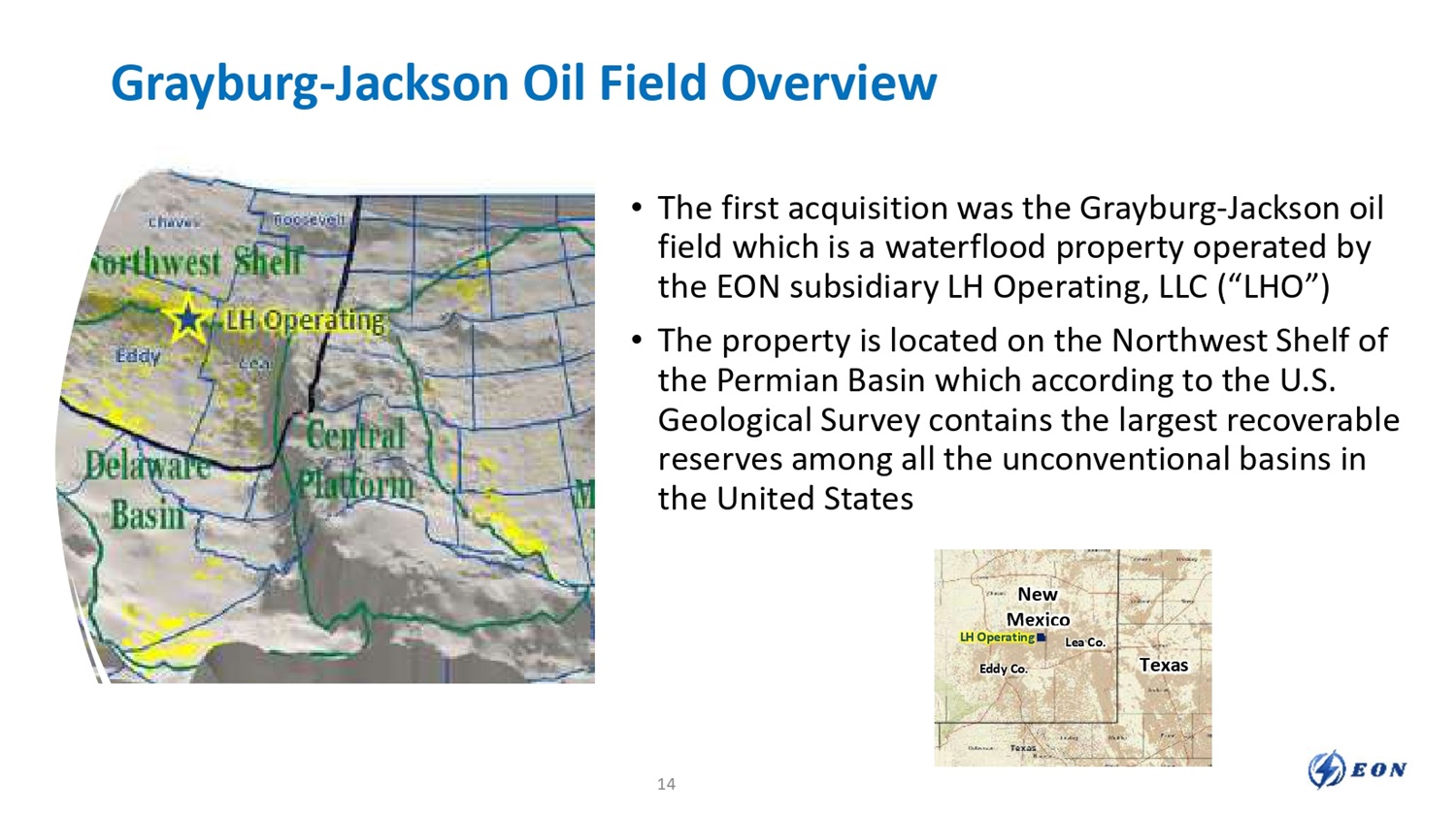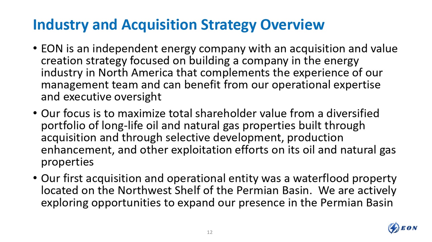 Industry and Acquisition Strategy Overview • EON is an independent energy company with an acquisition and value creation strategy focused on building a company in the energy industry in North America that complements the experience of our management team and can benefit from our operational expertise and executive oversight • Our focus is to maximize total shareholder value from a diversified portfolio of long - life oil and natural gas properties built through acquisition and through selective development, production enhancement, and other exploitation efforts on its oil and natural gas properties • Our first acquisition and operational entity was a waterflood property located on the Northwest Shelf of the Permian Basin . We are actively exploring opportunities to expand our presence in the Permian Basin 12