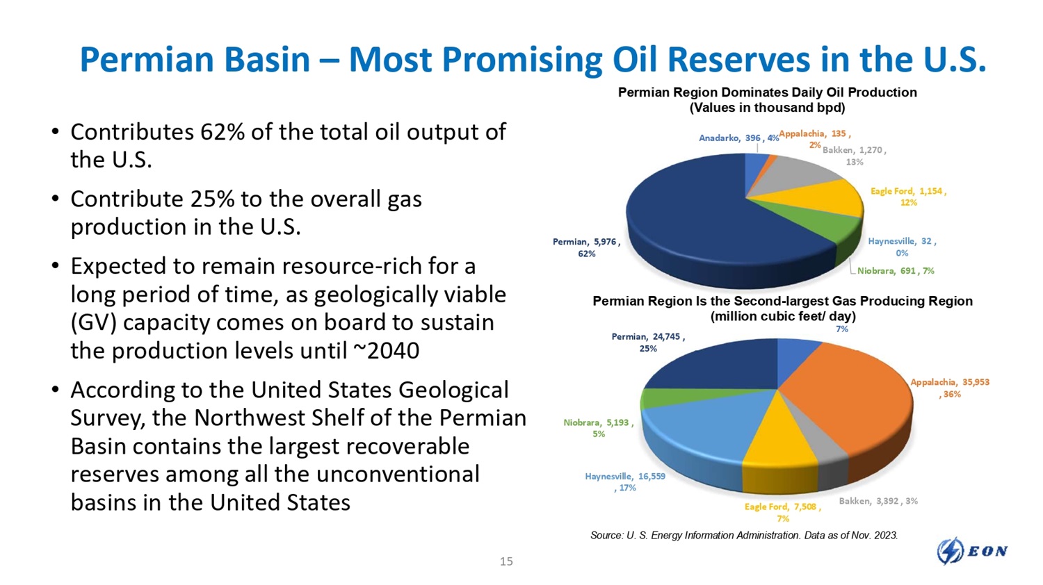 • The first acquisition was the Grayburg - Jackson oil field which is a waterflood property operated by the EON subsidiary LH Operating, LLC (“LHO”) • The property is located on the Northwest Shelf of the Permian Basin which according to the U.S. Geological Survey contains the largest recoverable reserves among all the unconventional basins in the United States Grayburg - Jackson Oil Field Overview Mex New ico Texas Eddy Co. Lea Co. LH Operating 14