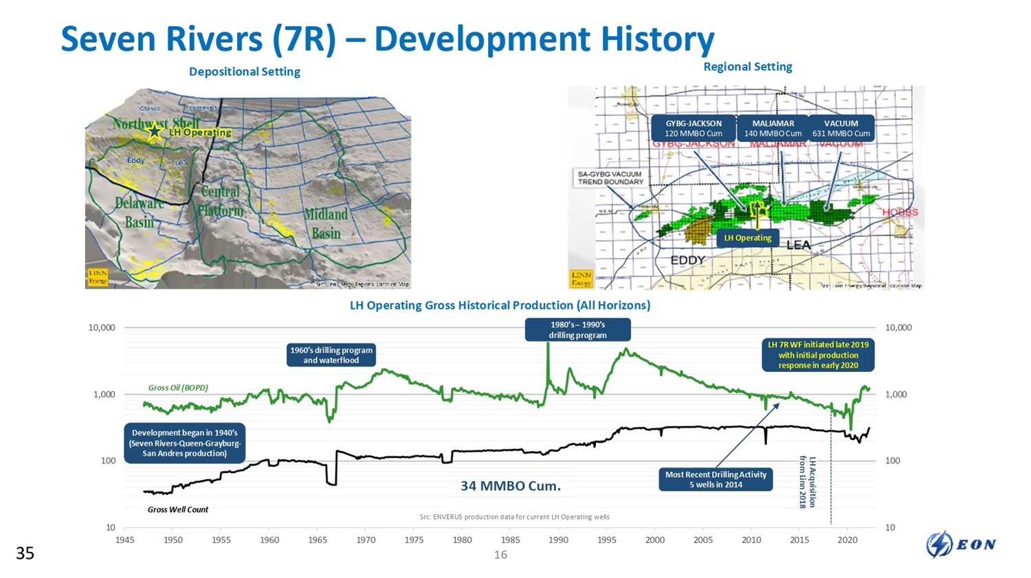 Seven Rivers (7R) Waterflood Development 7R Waterflood Development Pilot Response Starts Early 2020 Current 7R Waterflood Response • LH Operating’s 7R WF work began late 2019 in the H E West B 4 - pattern pilot with initial production response in February 2020 • 95 patterns have been brought online as of mid - 2022 (includes pilot) • 7R gross oil production from these 95 patterns has sustained ~1,000 BOPD • 95 pattern 7R OOIP = 30 MMBO Remaining 7R Waterflood Development • Additional 158 waterflood patterns planned (PDNP + PUD) • Full waterflood development requires approximately 214 workovers, 56 CTI’s, 55 re - entries of plugged wells, 24 new - drill producers, and 39 new - drill injectors • 158 pattern 7R OOIP = 50 MMBO 7R PDP Response (95 Patterns) – Gross Oil (BOPD) 10,000 1 10 100 1,000 02/2020 04/2020 06/2020 08/2020 10/2020 12/2020 02/2021 04/2021 06/2021 08/2021 10/2021 12/2021 02/2022 04/2022 06/2022 08/2022 4 - Pattern Pilot Response Starts 95 PDP Patterns Online ~1,000 BOPD Production shown does not include Legacy production 7R Pattern Count Gross 7R BOPD 36 17