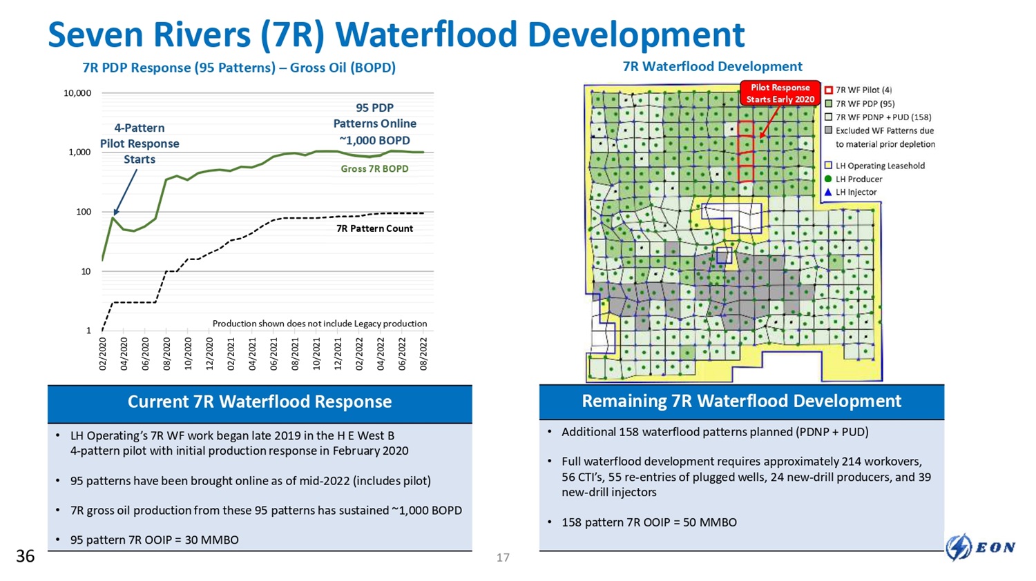 10 100 1,000 10,000 10 100 1,000 10,000 1945 1950 1955 1960 1965 1970 2000 2005 2010 2015 2020 Seven Rivers (7R) – Development History Depositional Setting LH Operating Regional Setting GYBG - JACKSON 120 MMBO Cum MALJAMAR 140 MMBO Cum VACUUM 631 MMBO Cum LH Operating Gross Oil (BOPD) Gross Well Count Development began in 1940’s (Seven Rivers - Queen - Grayburg - San Andres production) 1960’s drilling program and waterflood LH Operating Gross Historical Production (All Horizons) 1980’s – 1990’s drilling program 34 MMBO Cum. Src: ENVERUS production data for current LH Operating wells 1975 1980 1985 1990 1995 Most Recent Drilling Activity 5 wells in 2014 LH 7R WF initiated late 2019 with initial production response in early 2020 LH Acquisition from Linn 2018 35 16