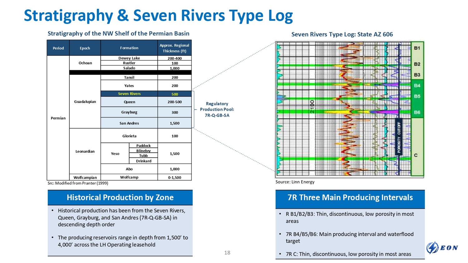 Regulatory Production Pool: 7R - Q - GB - SA Approx. Regional Thickness (ft) Formation Epoch Period 200 - 400 Dewey Lake Ochoan Permian 100 Rustler 1,000 Salado 200 Tansil Guadalupian 200 Yates 500 Seven Rivers 200 - 500 Queen 300 Grayburg 1,500 San Andres 100 Glorieta Leonardian 1,500 Paddock Yeso Blinebry Tubb Drinkard 1,000 Abo 0 - 1,500 Wolfcamp Wolfcampian Historical Production by Zone • Historical production has been from the Seven Rivers, Queen, Grayburg, and San Andres (7R - Q - GB - SA) in descending depth order • The producing reservoirs range in depth from 1,500’ to 4,000’ across the LH Operating leasehold Stratigraphy & Seven Rivers Type Log Source: Linn Energy Src: Modified from Pranter (1999) 7R Three Main Producing Intervals • R B1/B2/B3: Thin, discontinuous, low porosity in most areas • 7R B4/B5/B6: Main producing interval and waterflood target • 7R C: Thin, discontinuous, low porosity in most areas Stratigraphy of the NW Shelf of the Permian Basin Seven Rivers Type Log: State AZ 606 18