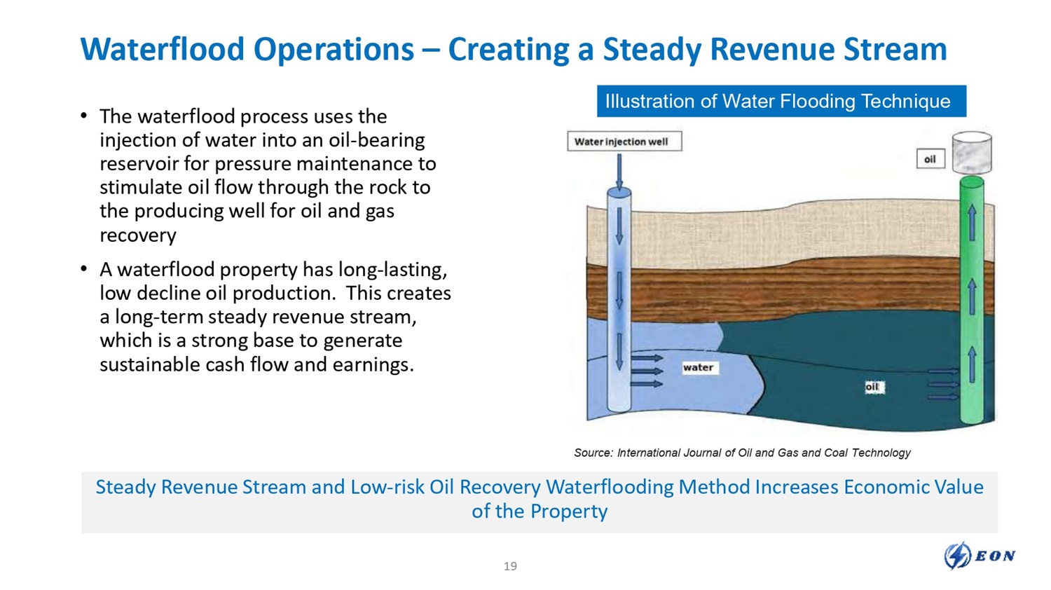Waterflood Operations – Creating a Steady Revenue Stream • The waterflood process uses the injection of water into an oil - bearing reservoir for pressure maintenance to stimulate oil flow through the rock to the producing well for oil and gas recovery • A waterflood property has long - lasting, low decline oil production. This creates a long - term steady revenue stream, which is a strong base to generate sustainable cash flow and earnings. Illustration of Water Flooding Technique Source: International Journal of Oil and Gas and Coal Technology Steady Revenue Stream and Low - risk Oil Recovery Waterflooding Method Increases Economic Value of the Property Steady Revenue Stream and Low - risk Oil Recovery Waterflooding Method Increases Economic Value of the Property 19