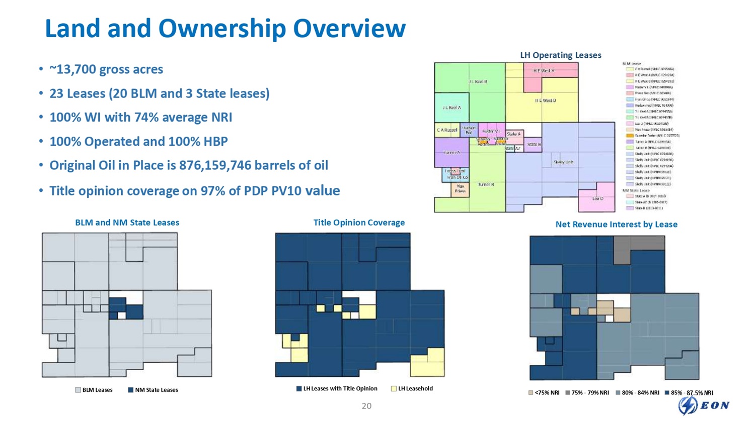 • ~13,700 gross acres • 23 Leases (20 BLM and 3 State leases) • 100% WI with 74% average NRI • 100% Operated and 100% HBP • Original Oil in Place is 876,159,746 barrels of oil • Title opinion coverage on 97% of PDP PV10 value BLM and NM State Leases Title Opinion Coverage BLM Leases NM State Leases LH Leases with Title Opinion LH Leasehold <75% NRI 75% - 79% NRI 85% - 87.5% NRI 80% - 84% NRI Net Revenue Interest by Lease LH Operating Leases Land and Ownership Overview 20