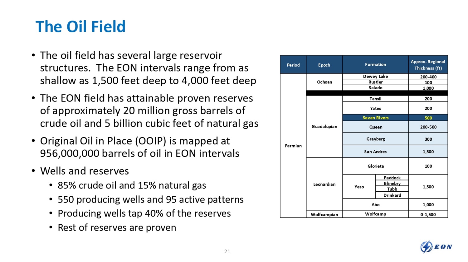 The Oil Field • The oil field has several large reservoir structures. The EON intervals range from as shallow as 1,500 feet deep to 4,000 feet deep • The EON field has attainable proven reserves of approximately 20 million gross barrels of crude oil and 5 billion cubic feet of natural gas • Original Oil in Place (OOIP) is mapped at 956,000,000 barrels of oil in EON intervals • Wells and reserves • 85% crude oil and 15% natural gas • 550 producing wells and 95 active patterns • Producing wells tap 40% of the reserves • Rest of reserves are proven Approx. Regional Thickness (ft) Formation Epoch Period 200 - 400 Dewey Lake Ochoan Permian 100 Rustler 1,000 Salado 200 Tansil Guadalupian 200 Yates 500 Seven Rivers 200 - 500 Queen 300 Grayburg 1,500 San Andres 100 Glorieta Leonardian 1,500 Paddock Yeso Blinebry Tubb Drinkard 1,000 Abo 0 - 1,500 Wolfcamp Wolfcampian 21