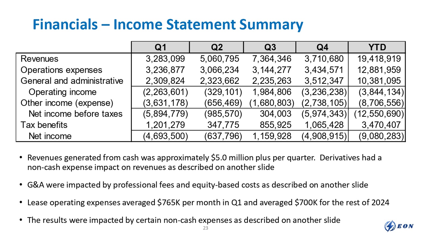 Financials – Income Statement Summary • Revenues generated from cash was approximately $5.0 million plus per quarter. Derivatives had a non - cash expense impact on revenues as described on another slide • G&A were impacted by professional fees and equity - based costs as described on another slide • Lease operating expenses averaged $765K per month in Q1 and averaged $700K for the rest of 2024 • The results were impacted by certain non - cash expenses as described on another slide 23 YTD Q4 Q3 Q2 Q1 19,418,919 3,710,680 7,364,346 5,060,795 3,283,099 Revenues 12,881,959 3,434,571 3,144,277 3,066,234 3,236,877 Operations expenses 10,381,095 3,512,347 2,235,263 2,323,662 2,309,824 General and administrative (3,844,134) (3,236,238) 1,984,806 (329,101) (2,263,601) Operating income (8,706,556) (2,738,105) (1,680,803) (656,469) (3,631,178) Other income (expense) (12,550,690) (5,974,343) 304,003 (985,570) (5,894,779) Net income before taxes 3,470,407 1,065,428 855,925 347,775 1,201,279 Tax benefits (9,080,283) (4,908,915) 1,159,928 (637,796) (4,693,500) Net income