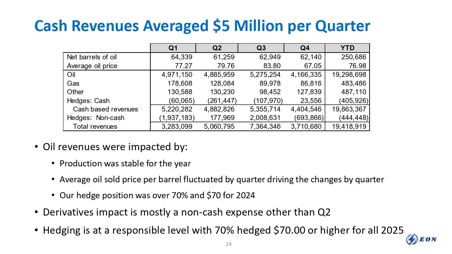 Cash Revenues Averaged $5 Million per Quarter • Oil revenues were impacted by: • Production was stable for the year • Average oil sold price per barrel fluctuated by quarter driving the changes by quarter • Our hedge position was over 70% and $70 for 2024 • Derivatives impact is mostly a non - cash expense other than Q2 • Hedging is at a responsible level with 70% hedged $70.00 or higher for all 2025 YTD Q4 Q3 Q2 Q1 250,686 62,140 62,949 61,259 64,339 Net barrels of oil 76.98 67.05 83.80 79.76 77.27 Average oil price 19,298,698 4,166,335 5,275,254 4,885,959 4,971,150 Oil 483,486 86,816 89,978 128,084 178,608 Gas 487,110 127,839 98,452 130,230 130,588 Other (405,926) 23,556 (107,970) (261,447) (60,065) Hedges: Cash 19,863,367 4,404,546 5,355,714 4,882,826 5,220,282 Cash based revenues (444,448) (693,866) 2,008,631 177,969 (1,937,183) Hedges: Non - cash 19,418,919 3,710,680 7,364,346 5,060,795 3,283,099 Total revenues 24