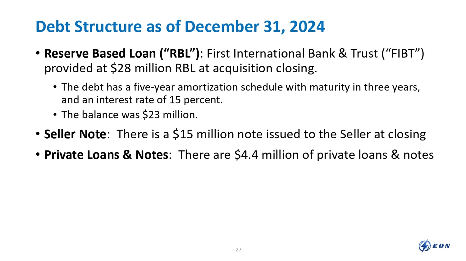 Debt Structure as of December 31, 2024 • Reserve Based Loan (“RBL”) : First International Bank & Trust (“FIBT”) provided at $28 million RBL at acquisition closing. • The debt has a five - year amortization schedule with maturity in three years, and an interest rate of 15 percent. • The balance was $23 million. • Seller Note : There is a $15 million note issued to the Seller at closing • Private Loans & Notes : There are $4.4 million of private loans & notes 27