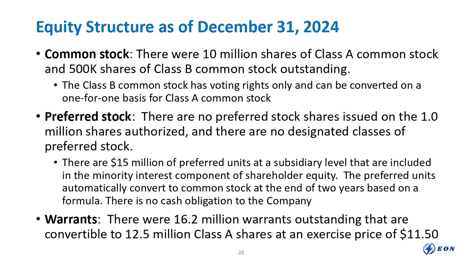Equity Structure as of December 31, 2024 • Common stock : There were 10 million shares of Class A common stock and 500K shares of Class B common stock outstanding. • The Class B common stock has voting rights only and can be converted on a one - for - one basis for Class A common stock • Preferred stock : There are no preferred stock shares issued on the 1.0 million shares authorized, and there are no designated classes of preferred stock. • There are $15 million of preferred units at a subsidiary level that are included in the minority interest component of shareholder equity. The preferred units automatically convert to common stock at the end of two years based on a formula. There is no cash obligation to the Company • Warrants : There were 16.2 million warrants outstanding that are convertible to 12.5 million Class A shares at an exercise price of $11.50 28