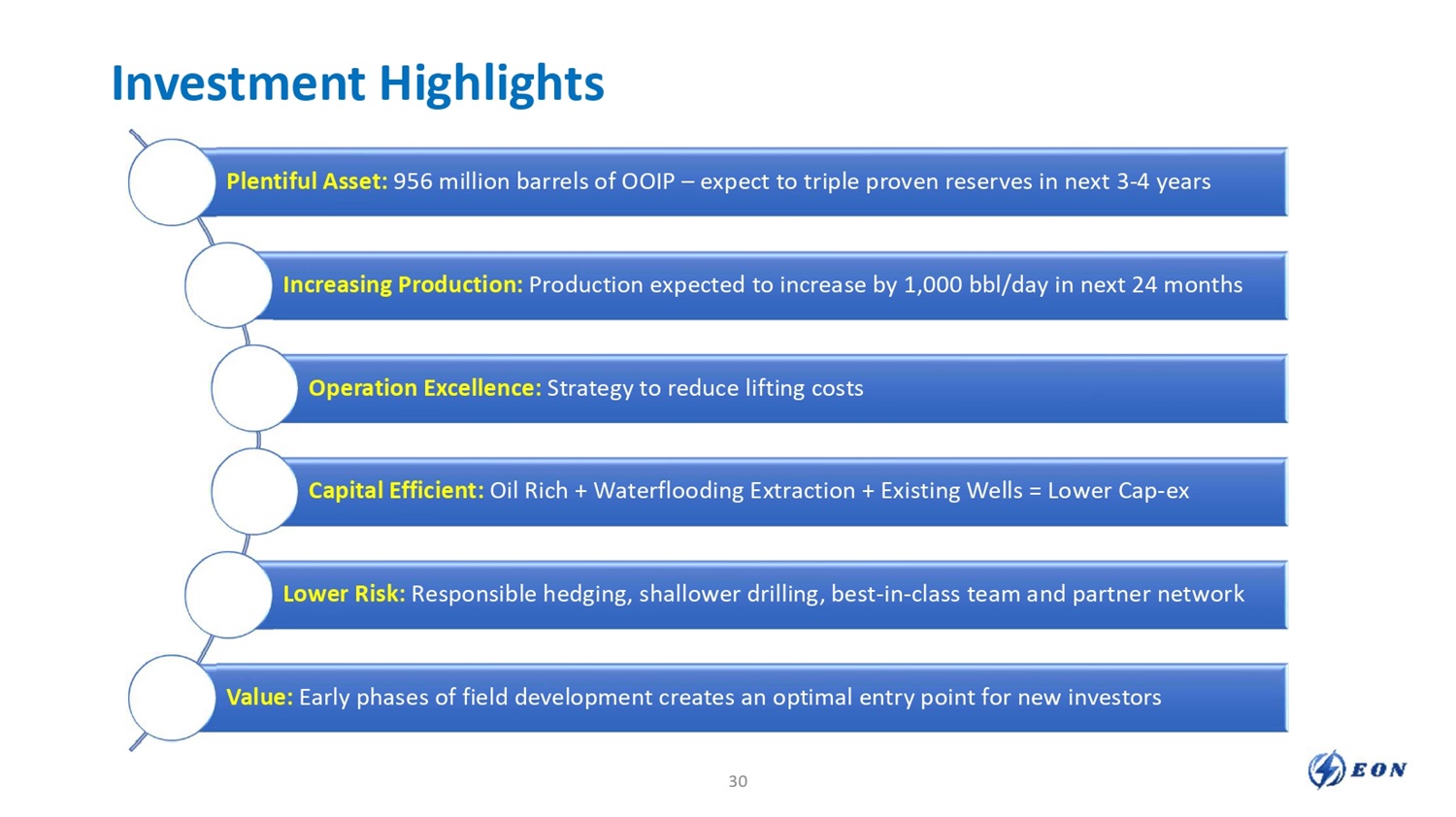 Investment Highlights Plentiful Asset: 956 million barrels of OOIP – expect to triple proven reserves in next 3 - 4 years Increasing Production: Production expected to increase by 1,000 bbl/day in next 24 months Operation Excellence: Strategy to reduce lifting costs Capital Efficient: Oil Rich + Waterflooding Extraction + Existing Wells = Lower Cap - ex Lower Risk: Responsible hedging, shallower drilling, best - in - class team and partner network Value: Early phases of field development creates an optimal entry point for new investors 30