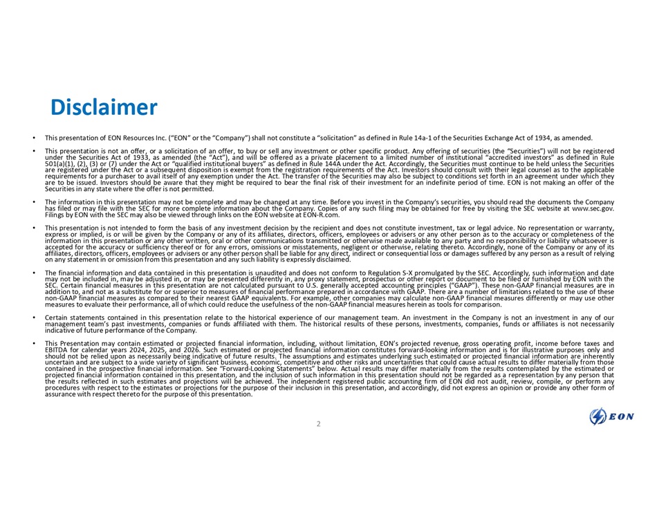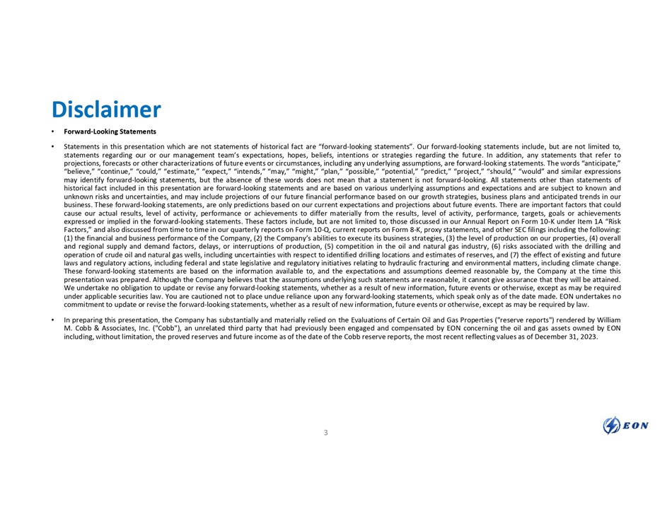 Disclaimer • This presentation of EON Resources Inc. (“EON” or the “Company”) shall not constitute a “solicitation” as defined in Rule 14a - 1 of the Securities Exchange Act of 1934, as amended. • This presentation is not an offer, or a solicitation of an offer, to buy or sell any investment or other specific product. Any offering of securities (the “Securities”) will not be registered under the Securities Act of 1933, as amended (the “Act”), and will be offered as a private placement to a limited number of institutional “accredited investors” as defined in Rule 501(a)(1), (2), (3) or (7) under the Act or “qualified institutional buyers” as defined in Rule 144A under the Act. Accordingly, the Securities must continue to be held unless the Securities are registered under the Act or a subsequent disposition is exempt from the registration requirements of the Act. Investors should consult with their legal counsel as to the applicable requirements for a purchaser to avail itself of any exemption under the Act. The transfer of the Securities may also be subject to conditions set forth in an agreement under which they are to be issued. Investors should be aware that they might be required to bear the final risk of their investment for an indefinite period of time. EON is not making an offer of the Securities in any state where the offer is not permitted. • The information in this presentation may not be complete and may be changed at any time. Before you invest in the Company’s securities, you should read the documents the Company has filed or may file with the SEC for more complete information about the Company. Copies of any such filing may be obtained for free by visiting the SEC website at www.sec.gov. Filings by EON with the SEC may also be viewed through links on the EON website at EON - R.com. • This presentation is not intended to form the basis of any investment decision by the recipient and does not constitute investment, tax or legal advice. No representation or warranty, express or implied, is or will be given by the Company or any of its affiliates, directors, officers, employees or advisers or any other person as to the accuracy or completeness of the information in this presentation or any other written, oral or other communications transmitted or otherwise made available to any party and no responsibility or liability whatsoever is accepted for the accuracy or sufficiency thereof or for any errors, omissions or misstatements, negligent or otherwise, relating thereto. Accordingly, none of the Company or any of its affiliates, directors, officers, employees or advisers or any other person shall be liable for any direct, indirect or consequential loss or damages suffered by any person as a result of relying on any statement in or omission from this presentation and any such liability is expressly disclaimed. • The financial information and data contained in this presentation is unaudited and does not conform to Regulation S - X promulgated by the SEC. Accordingly, such information and date may not be included in, may be adjusted in, or may be presented differently in, any proxy statement, prospectus or other report or document to be filed or furnished by EON with the SEC. Certain financial measures in this presentation are not calculated pursuant to U.S. generally accepted accounting principles (“GAAP”). These non - GAAP financial measures are in addition to, and not as a substitute for or superior to measures of financial performance prepared in accordance with GAAP. There are a number of limitations related to the use of these non - GAAP financial measures as compared to their nearest GAAP equivalents. For example, other companies may calculate non - GAAP financial measures differently or may use other measures to evaluate their performance, all of which could reduce the usefulness of the non - GAAP financial measures herein as tools for comparison. • Certain statements contained in this presentation relate to the historical experience of our management team. An investment in the Company is not an investment in any of our management team’s past investments, companies or funds affiliated with them. The historical results of these persons, investments, companies, funds or affiliates is not necessarily indicative of future performance of the Company. • This Presentation may contain estimated or projected financial information, including, without limitation, EON’s projected revenue, gross operating profit, income before taxes and EBITDA for calendar years 2024, 2025, and 2026. Such estimated or projected financial information constitutes forward - looking information and is for illustrative purposes only and should not be relied upon as necessarily being indicative of future results. The assumptions and estimates underlying such estimated or projected financial information are inherently uncertain and are subject to a wide variety of significant business, economic, competitive and other risks and uncertainties that could cause actual results to differ materially from those contained in the prospective financial information. See “Forward - Looking Statements” below. Actual results may differ materially from the results contemplated by the estimated or projected financial information contained in this presentation, and the inclusion of such information in this presentation should not be regarded as a representation by any person that the results reflected in such estimates and projections will be achieved. The independent registered public accounting firm of EON did not audit, review, compile, or perform any procedures with respect to the estimates or projections for the purpose of their inclusion in this presentation, and accordingly, did not express an opinion or provide any other form of assurance with respect thereto for the purpose of this presentation. 2