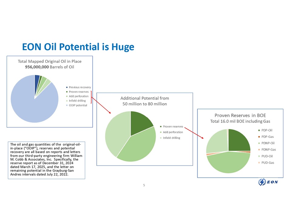 EON Oil Potential is Huge The oil and gas quantities of the original - oil - in - place (“OOIP”), reserves and potential recovery are all based on reports and letters from our third - party engineering firm William M. Cobb & Associates, Inc. Specifically, the reserve report as of December 31, 2024 dated March 17, 2025, and the letter on remaining potential in the Grayburg - San Andres intervals dated July 22, 2022. 5