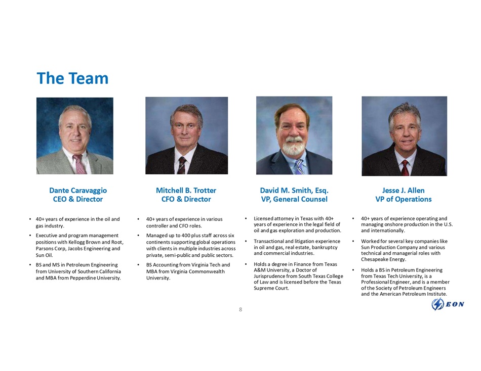 Five Strategic Priorities Build Team and Public Company Build Team and Public Company Optimize Production Optimize Production Reduce Operating Cost Reduce Operating Cost Enhance Capital Efficiencies Enhance Capital Efficiencies Build a Portfolio of Energy Assets Build a Portfolio of Energy Assets Experienced Oil & Gas industry professionals with a strong network Potential untapped reserves in our 956 million of OOIP Opportunity to drive supply and equipment costs down Significant reserves can be tapped with existing well Permian Basin is hot market with over 100 billion of recent M&A activity 7