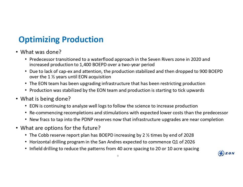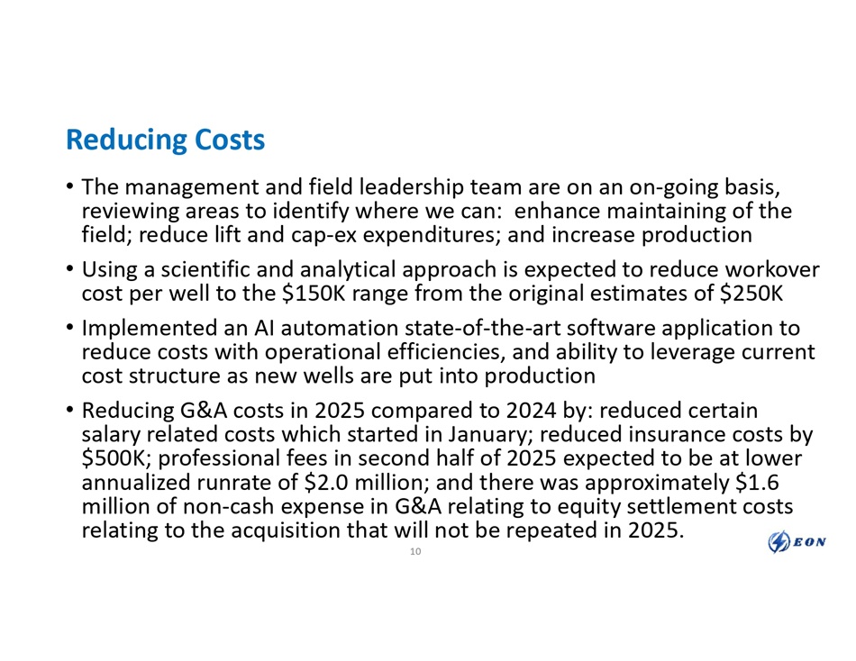 Optimizing Production • What was done? • Predecessor transitioned to a waterflood approach in the Seven Rivers zone in 2020 and increased production to 1,400 BOEPD over a two - year period • Due to lack of cap - ex and attention, the production stabilized and then dropped to 900 BOEPD over the 1 ½ years until EON acquisition • The EON team has been upgrading infrastructure that has been restricting production • Production was stabilized by the EON team and production is starting to tick upwards • What is being done? • EON is continuing to analyze well logs to follow the science to increase production • Re - commencing recompletions and stimulations with expected lower costs than the predecessor • New fracs to tap into the PDNP reserves now that infrastructure upgrades are near completion • What are options for the future? • The Cobb reserve report plan has BOEPD increasing by 2 ½ times by end of 2028 • Horizontal drilling program in the San Andres expected to commence Q1 of 2026 • Infield drilling to reduce the patterns from 40 acre spacing to 20 or 10 acre spacing 9