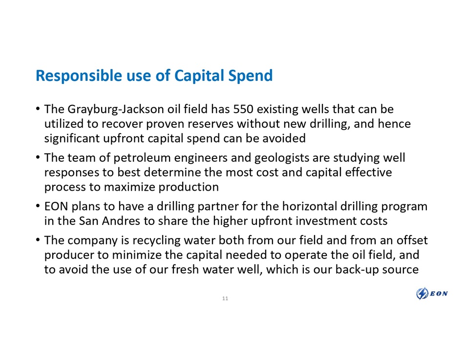 Reducing Costs • The management and field leadership team are on an on - going basis, reviewing areas to identify where we can: enhance maintaining of the field; reduce lift and cap - ex expenditures; and increase production • Using a scientific and analytical approach is expected to reduce workover cost per well to the $150K range from the original estimates of $250K • Implemented an AI automation state - of - the - art software application to reduce costs with operational efficiencies, and ability to leverage current cost structure as new wells are put into production • Reducing G&A costs in 2025 compared to 2024 by: reduced certain salary related costs which started in January; reduced insurance costs by $500K; professional fees in second half of 2025 expected to be at lower annualized runrate of $2.0 million; and there was approximately $1.6 million of non - cash expense in G&A relating to equity settlement costs relating to the acquisition that will not be repeated in 2025. 10