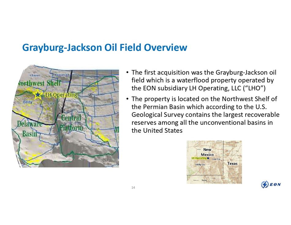 Industry and Acquisition Strategy Overview • EON is an independent energy company with an acquisition and value creation strategy focused on building a company in the energy industry in North America that complements the experience of our management team and can benefit from our operational expertise and executive oversight • Our focus is to maximize total shareholder value from a diversified portfolio of long - life oil and natural gas properties built through acquisition and through selective development, production enhancement, and other exploitation efforts on its oil and natural gas properties • Our first acquisition and operational entity was a waterflood property located on the Northwest Shelf of the Permian Basin . We are actively exploring opportunities to expand our presence in the Permian Basin 12
