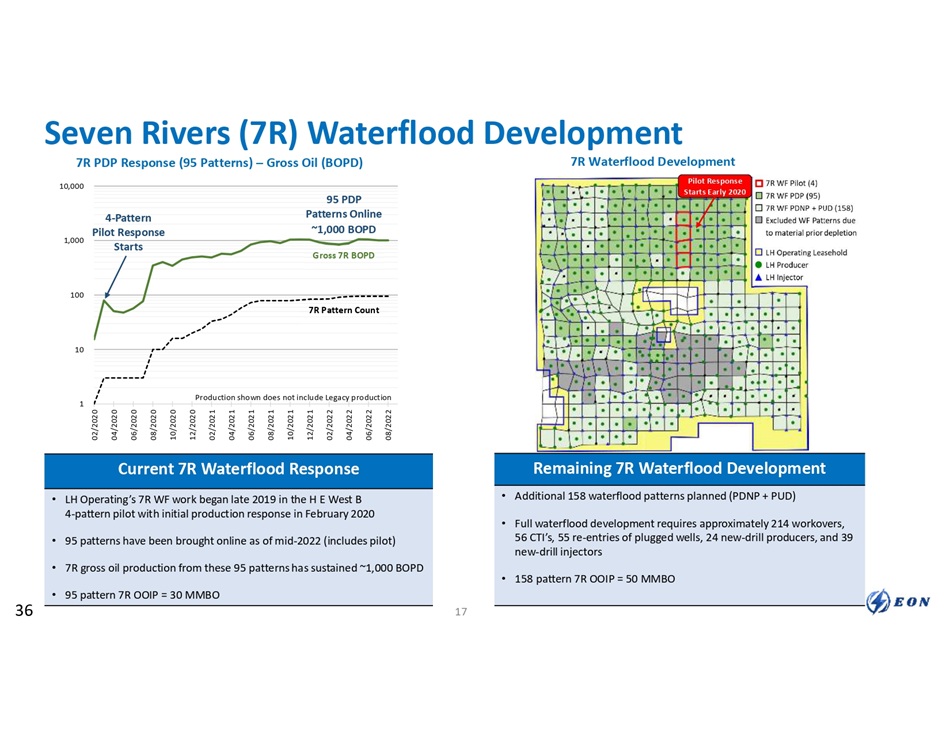 Seven Rivers (7R) Waterflood Development 7R Waterflood Development Pilot Response Starts Early 2020 Current 7R Waterflood Response • LH Operating’s 7R WF work began late 2019 in the H E West B 4 - pattern pilot with initial production response in February 2020 • 95 patterns have been brought online as of mid - 2022 (includes pilot) • 7R gross oil production from these 95 patterns has sustained ~1,000 BOPD • 95 pattern 7R OOIP = 30 MMBO Remaining 7R Waterflood Development • Additional 158 waterflood patterns planned (PDNP + PUD) • Full waterflood development requires approximately 214 workovers, 56 CTI’s, 55 re - entries of plugged wells, 24 new - drill producers, and 39 new - drill injectors • 158 pattern 7R OOIP = 50 MMBO 7R PDP Response (95 Patterns) – Gross Oil (BOPD) 10,000 1 10 100 1,000 02/2020 04/2020 06/2020 08/2020 10/2020 12/2020 02/2021 04/2021 06/2021 08/2021 10/2021 12/2021 02/2022 04/2022 06/2022 08/2022 4 - Pattern Pilot Response Starts 95 PDP Patterns Online ~1,000 BOPD Production shown does not include Legacy production 7R Pattern Count Gross 7R BOPD 36 17