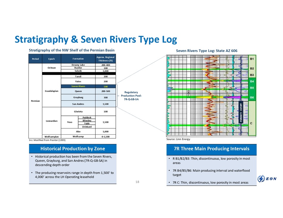 Regulatory Production Pool: 7R - Q - GB - SA Approx. Regional Thickness (ft) Formation Epoch Period 200 - 400 Dewey Lake Ochoan Permian 100 Rustler 1,000 Salado 200 Tansil Guadalupian 200 Yates 500 Seven Rivers 200 - 500 Queen 300 Grayburg 1,500 San Andres 100 Glorieta Leonardian 1,500 Paddock Yeso Blinebry Tubb Drinkard 1,000 Abo 0 - 1,500 Wolfcamp Wolfcampian Historical Production by Zone • Historical production has been from the Seven Rivers, Queen, Grayburg, and San Andres (7R - Q - GB - SA) in descending depth order • The producing reservoirs range in depth from 1,500’ to 4,000’ across the LH Operating leasehold Stratigraphy & Seven Rivers Type Log Source: Linn Energy Src: Modified from Pranter (1999) 7R Three Main Producing Intervals • R B1/B2/B3: Thin, discontinuous, low porosity in most areas • 7R B4/B5/B6: Main producing interval and waterflood target • 7R C: Thin, discontinuous, low porosity in most areas Stratigraphy of the NW Shelf of the Permian Basin Seven Rivers Type Log: State AZ 606 18