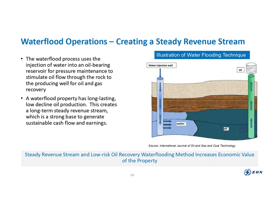 Waterflood Operations – Creating a Steady Revenue Stream • The waterflood process uses the injection of water into an oil - bearing reservoir for pressure maintenance to stimulate oil flow through the rock to the producing well for oil and gas recovery • A waterflood property has long - lasting, low decline oil production. This creates a long - term steady revenue stream, which is a strong base to generate sustainable cash flow and earnings. Illustration of Water Flooding Technique Source: International Journal of Oil and Gas and Coal Technology Steady Revenue Stream and Low - risk Oil Recovery Waterflooding Method Increases Economic Value of the Property Steady Revenue Stream and Low - risk Oil Recovery Waterflooding Method Increases Economic Value of the Property 19