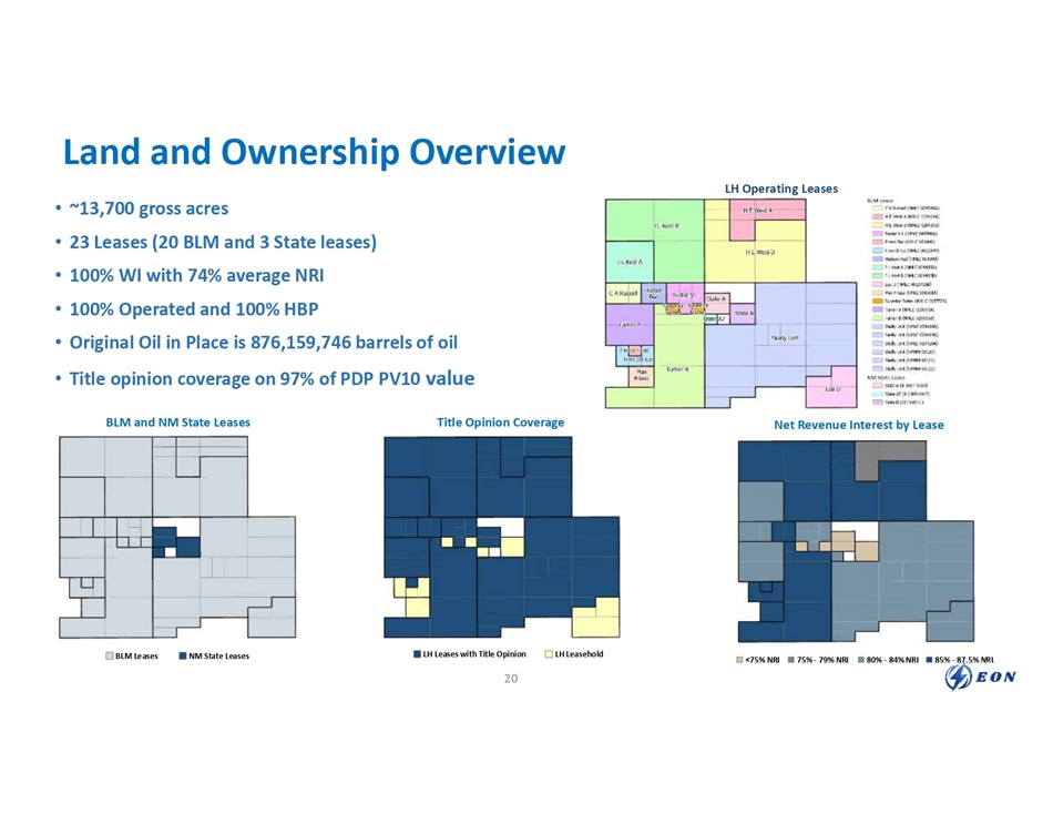 • ~13,700 gross acres • 23 Leases (20 BLM and 3 State leases) • 100% WI with 74% average NRI • 100% Operated and 100% HBP • Original Oil in Place is 876,159,746 barrels of oil • Title opinion coverage on 97% of PDP PV10 value BLM and NM State Leases Title Opinion Coverage BLM Leases NM State Leases LH Leases with Title Opinion LH Leasehold <75% NRI 75% - 79% NRI 85% - 87.5% NRI 80% - 84% NRI Net Revenue Interest by Lease LH Operating Leases Land and Ownership Overview 20