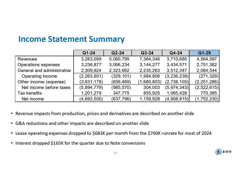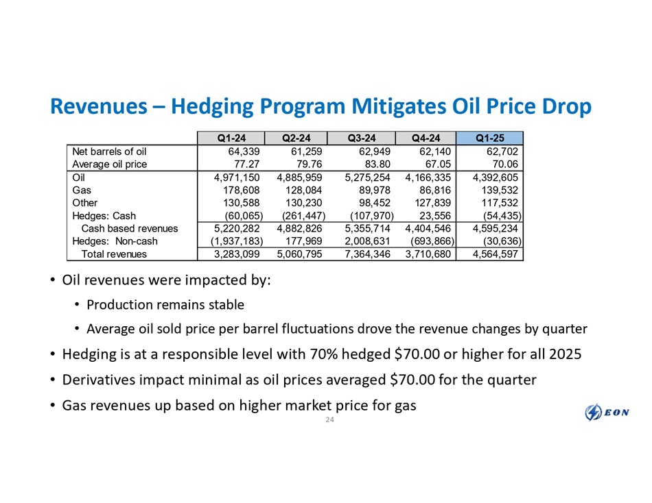 Income Statement Summary • Revenue impacts from production, prices and derivatives are described on another slide • G&A reductions and other impacts are described on another slide • Lease operating expenses dropped to $683K per month from the $700K runrate for most of 2024 • Interest dropped $165K for the quarter due to Note conversions 23 Q1 - 25 Q4 - 24 Q3 - 24 Q2 - 24 Q1 - 24 4,564,597 3,710,680 7,364,346 5,060,795 3,283,099 Revenues 2,751,382 3,434,571 3,144,277 3,066,234 3,236,877 Operations expenses 2,084,544 3,512,347 2,235,263 2,323,662 2,309,824 General and administrative (271,329) (3,236,238) 1,984,806 (329,101) (2,263,601) Operating income (2,251,286) (2,738,105) (1,680,803) (656,469) (3,631,178) Other income (expense) (2,522,615) (5,974,343) 304,003 (985,570) (5,894,779) Net income before taxes 770,385 1,065,428 855,925 347,775 1,201,279 Tax benefits (1,752,230) (4,908,915) 1,159,928 (637,796) (4,693,500) Net income